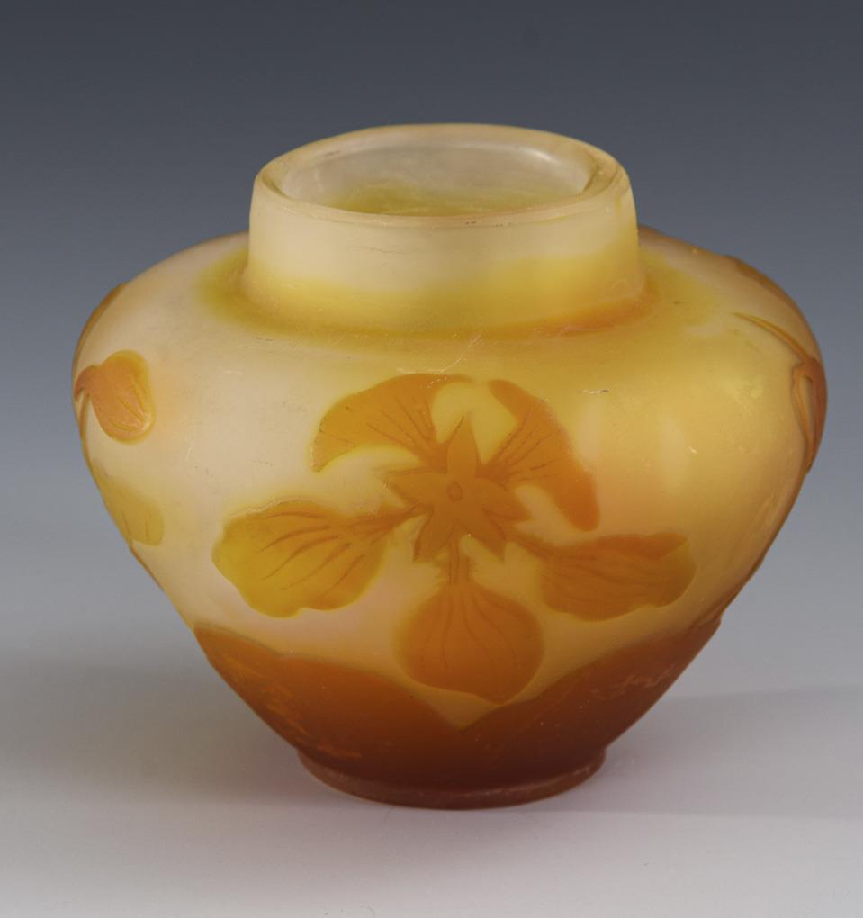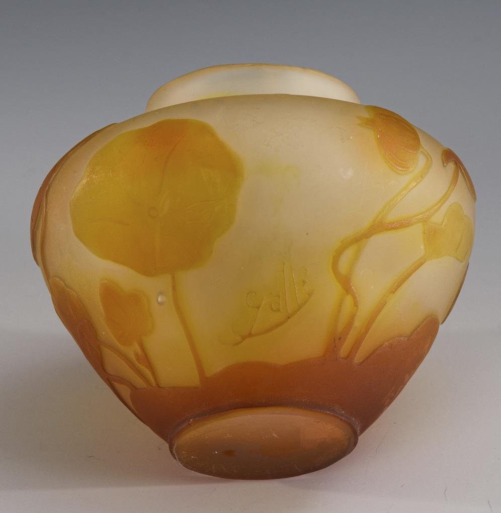 Balusterväschen mit umlaufend geätzten Kapuzinerkresseblüten; ausgekugelter Abriss.