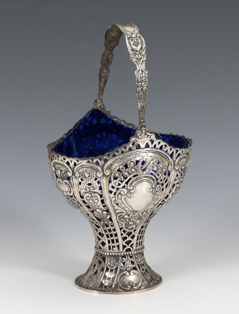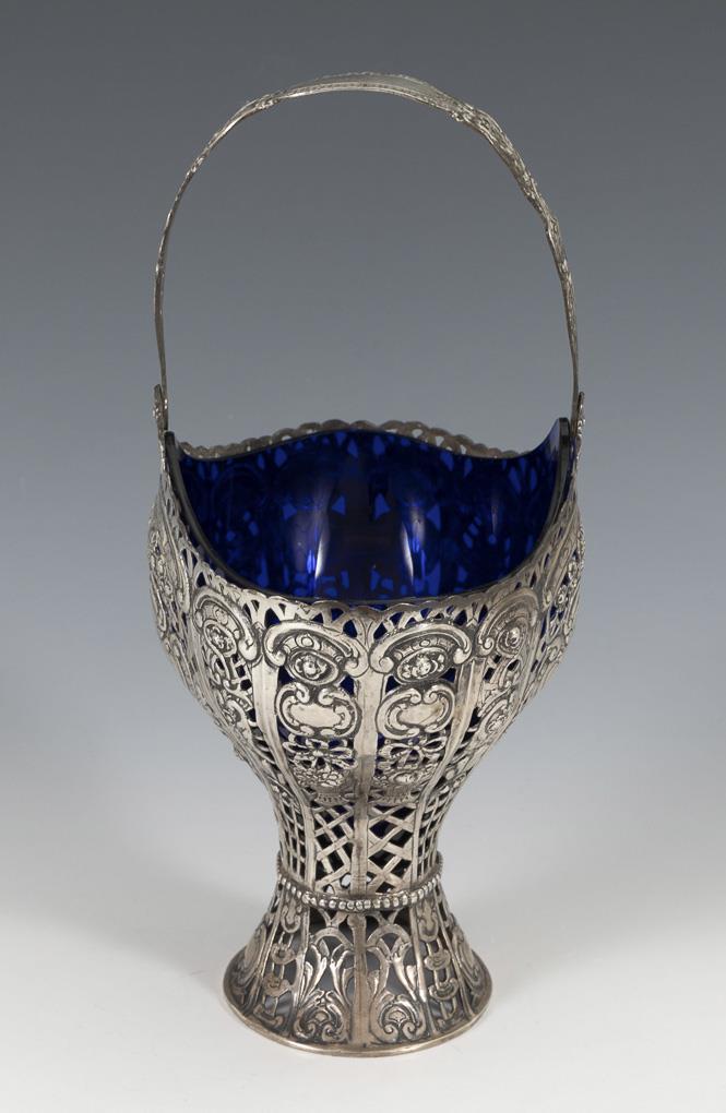 Reich reliefierter und floral durchbrochener Henkelkorb mit blauem Glaseinsatz. Leichte Altersspuren.
