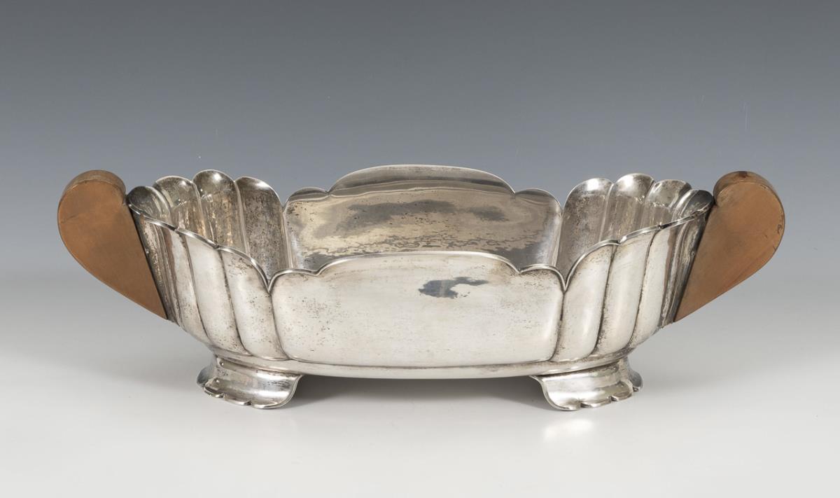 Ovale Schale mit fächerartig gegliederter Wandung und 2 Handhaben aus Holz. 1 Griff gelockert.