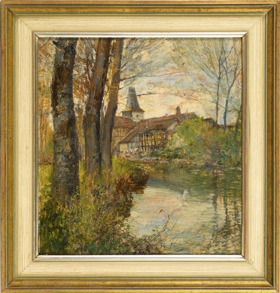 Blick über den Fluss zu einem großen Fachwerkgebäude vor einer Kirche. Altersspuren.