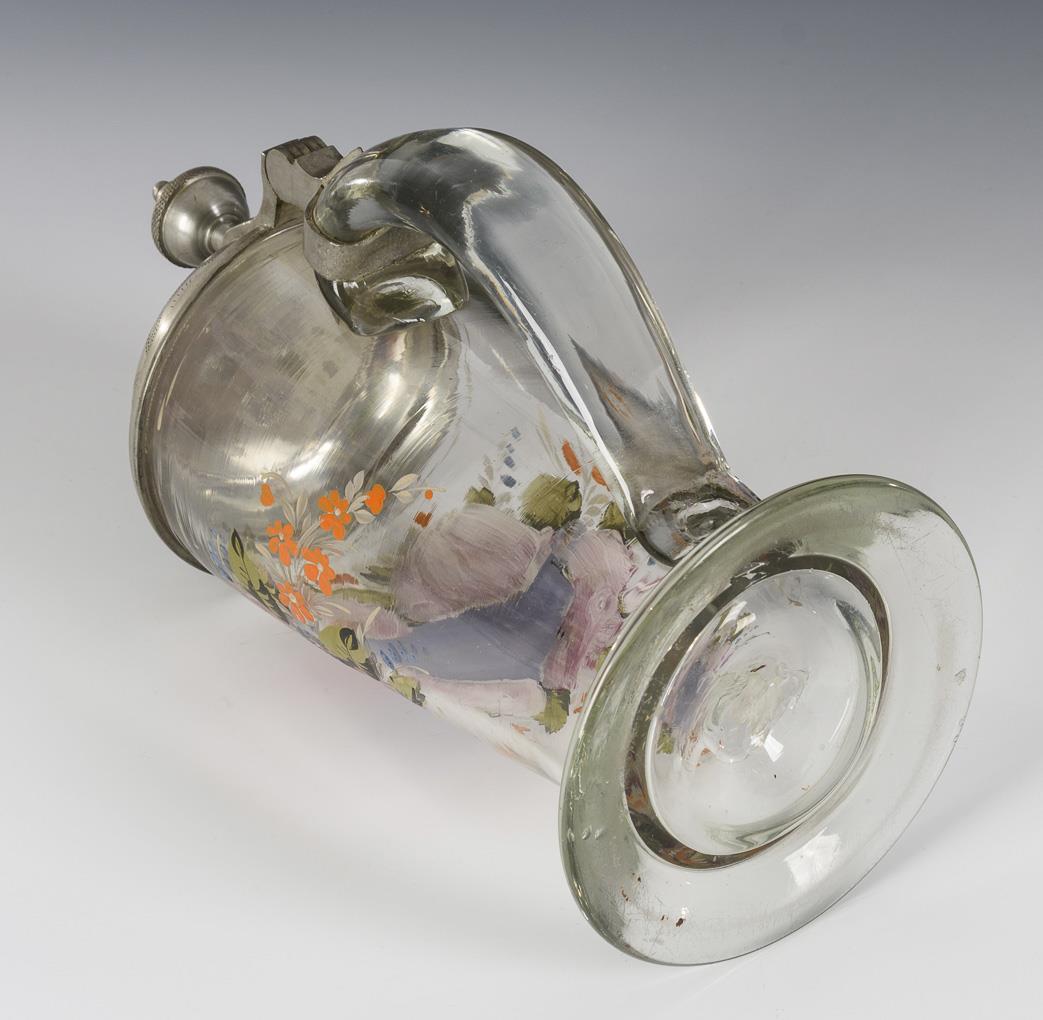 Farbloses, leicht schlieriges Glas, polychrome Emailmalerei, Zinn. H 24,5 cm.