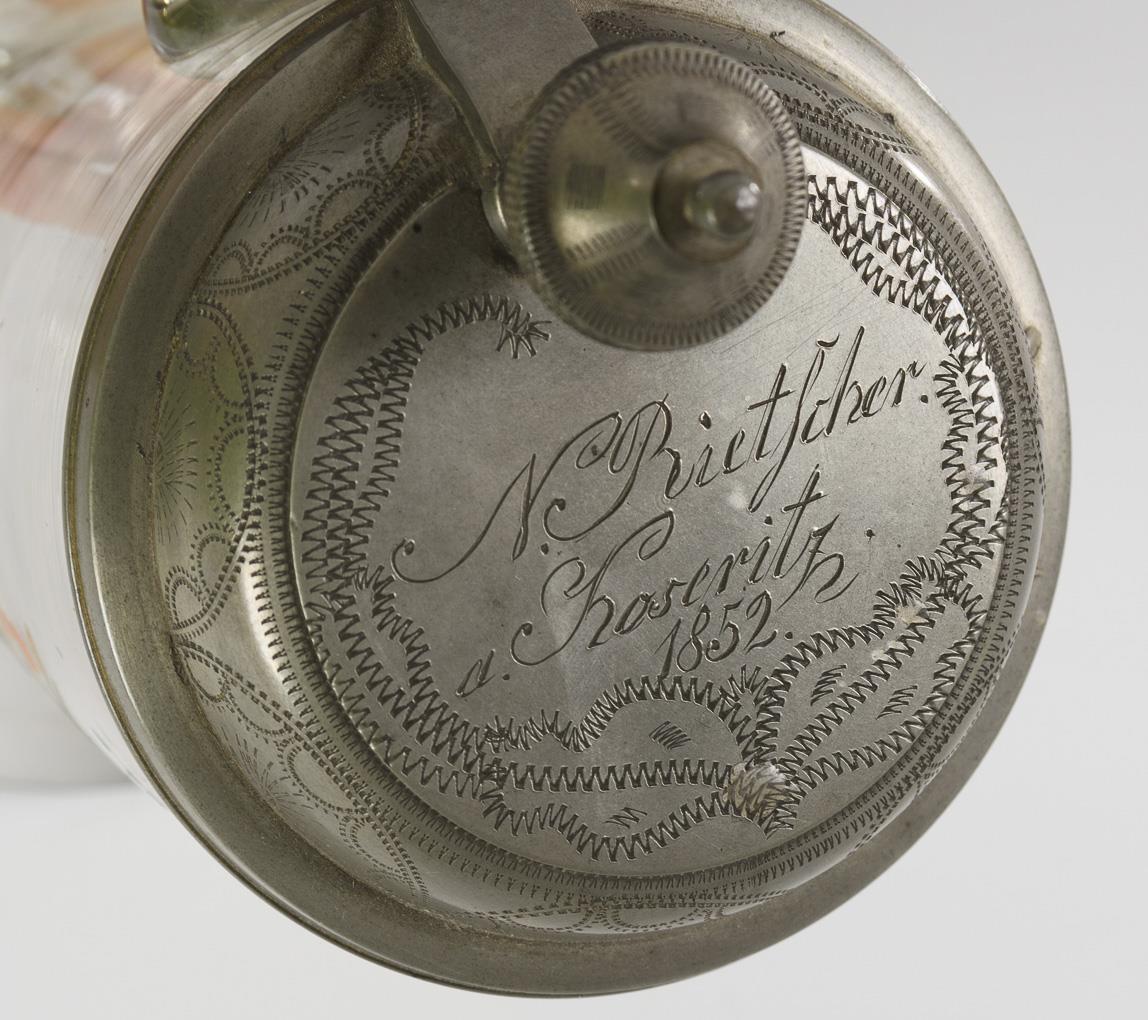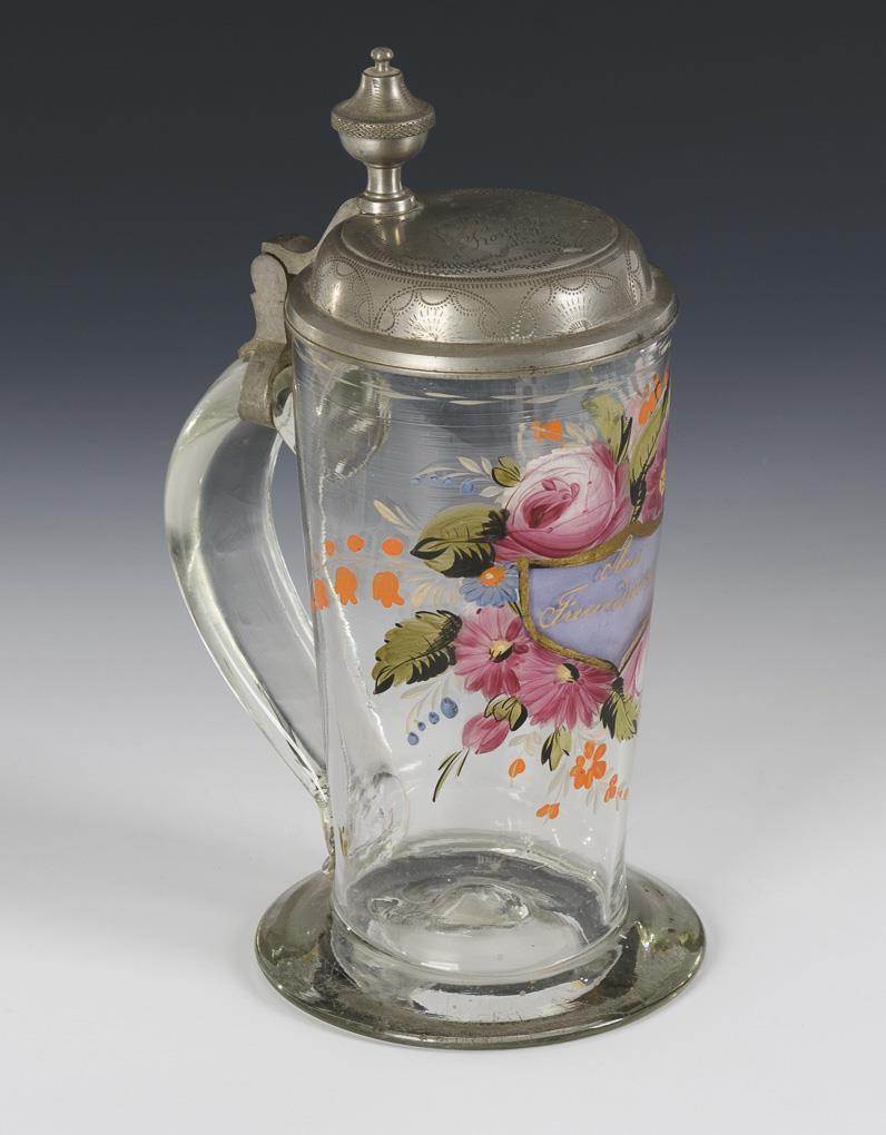 Leicht konischer Krug mit Bandhenkel und zinnmontiertem Scharnierdeckel; Abriss. Schauseitig ein Blumenbukett mit blauem Schild, darauf die Aufschrift "Aus Freundschaft". Auf dem Deckel die Gravur "N. Rietscher a. Koseritz. 1852".