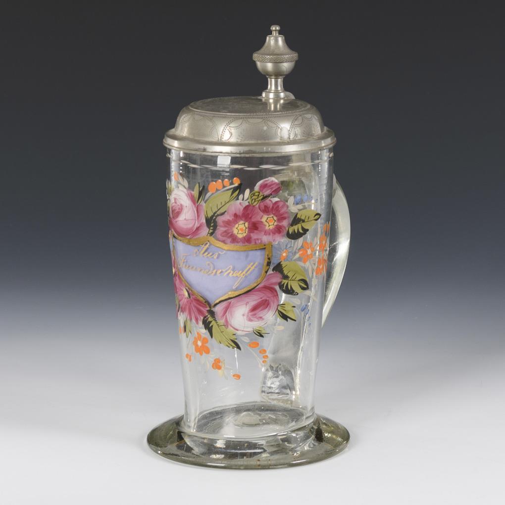 Leicht konischer Krug mit Bandhenkel und zinnmontiertem Scharnierdeckel; Abriss. Schauseitig ein Blumenbukett mit blauem Schild, darauf die Aufschrift "Aus Freundschaft". Auf dem Deckel die Gravur "N. Rietscher a. Koseritz. 1852".