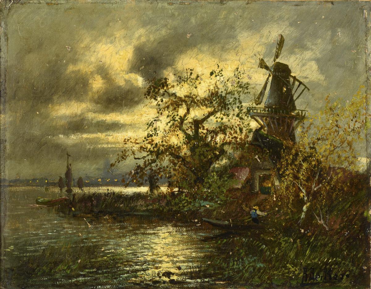 Windmühle mit Kahnfahrer in der Abendsonne bzw. Bauernhaus am Flussufer am Abend. Minimale Altersspuren.