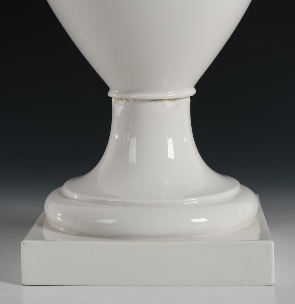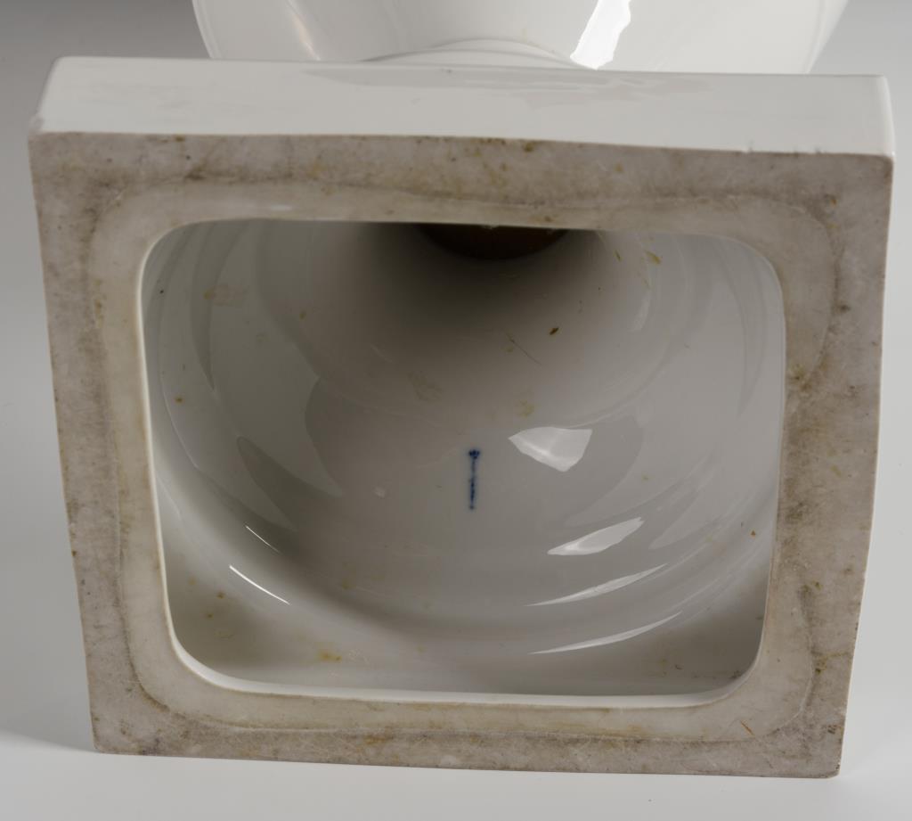 "Französische Vase". Ovoider Korpus mit zwei Greifenkopfhenkeln, Kraterhals, Rundfuß, quadratische Plinthe. Fußrand am Übergang zur Korpusmontierung bestoßen, Bestoßung an 1 Plinthenecke und am Plinthenrand.