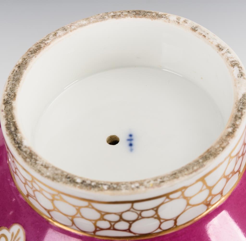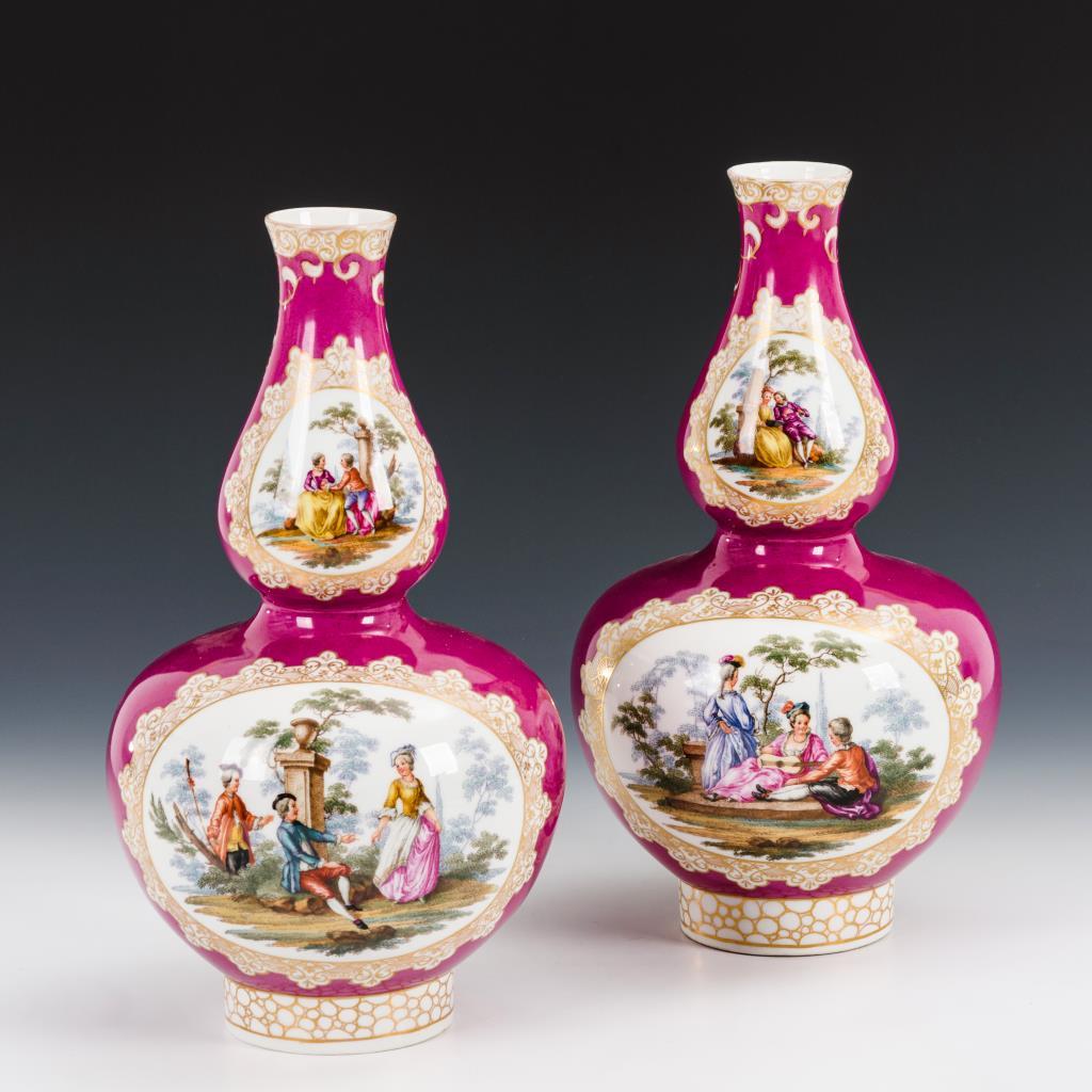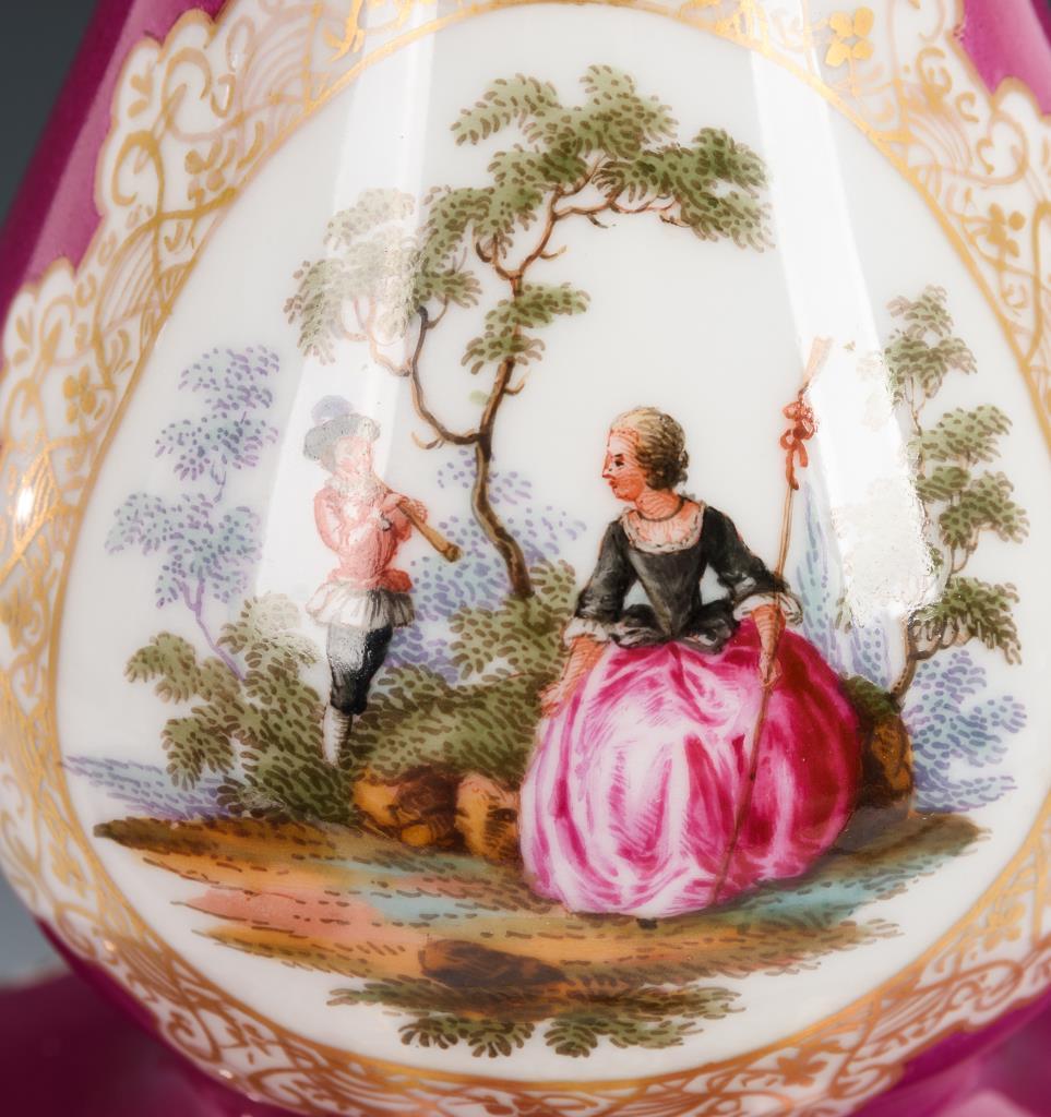 Kürbisform mit purpurfarbenem Fond, in vier goldspitzengerahmten Kartuschen die Darstellung von galanten Szenen. Jeweils 1 Loch im Boden (wohl Verwendung als Lampenfuß). Minimaler Goldabrieb.