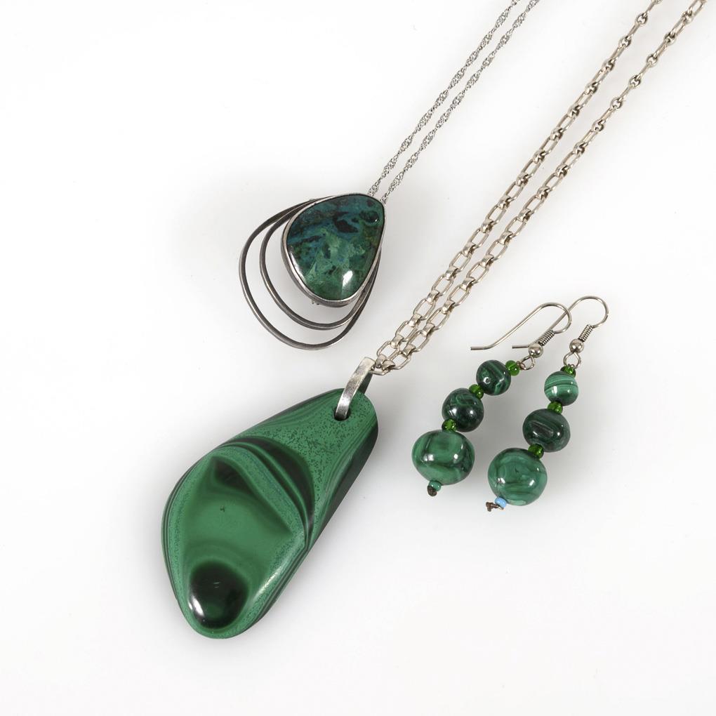 Großer Anhänger an grober Ankerkette und Ohrhängerpaar mit Malachiten. Brosche/Anhänger mit zargengefasstem Eilatstein an Panzerkette. Karabinerschließe, starre Öse.