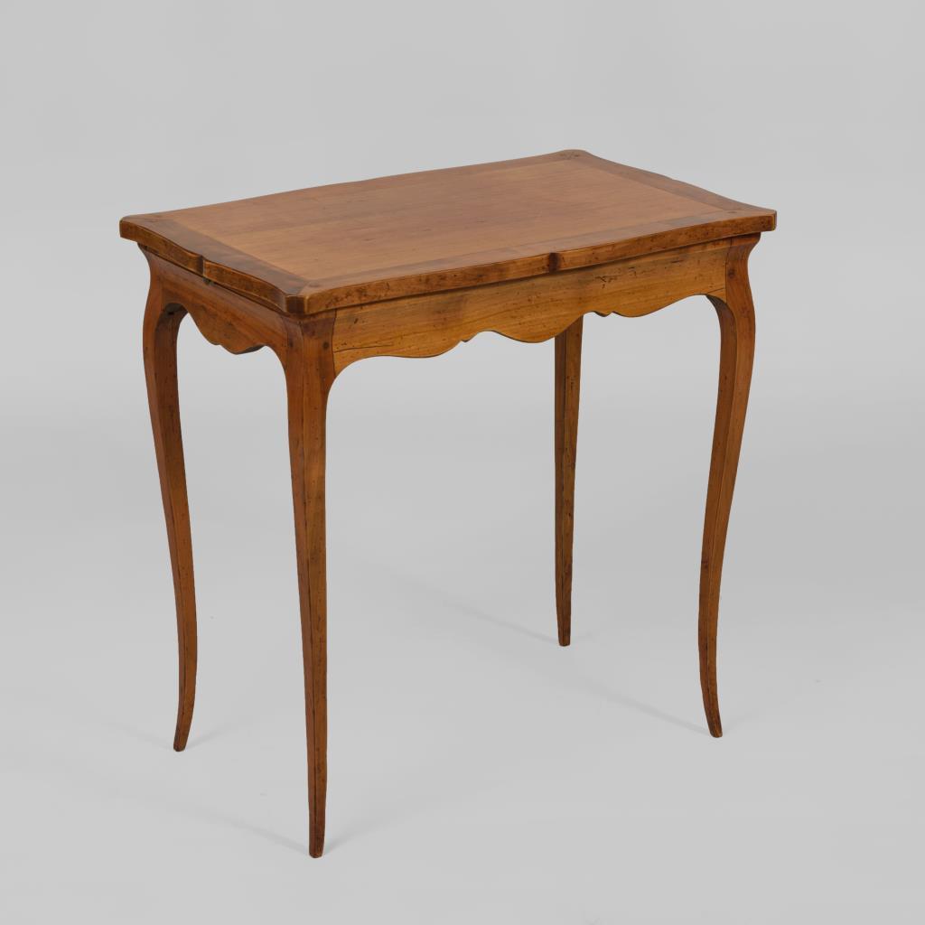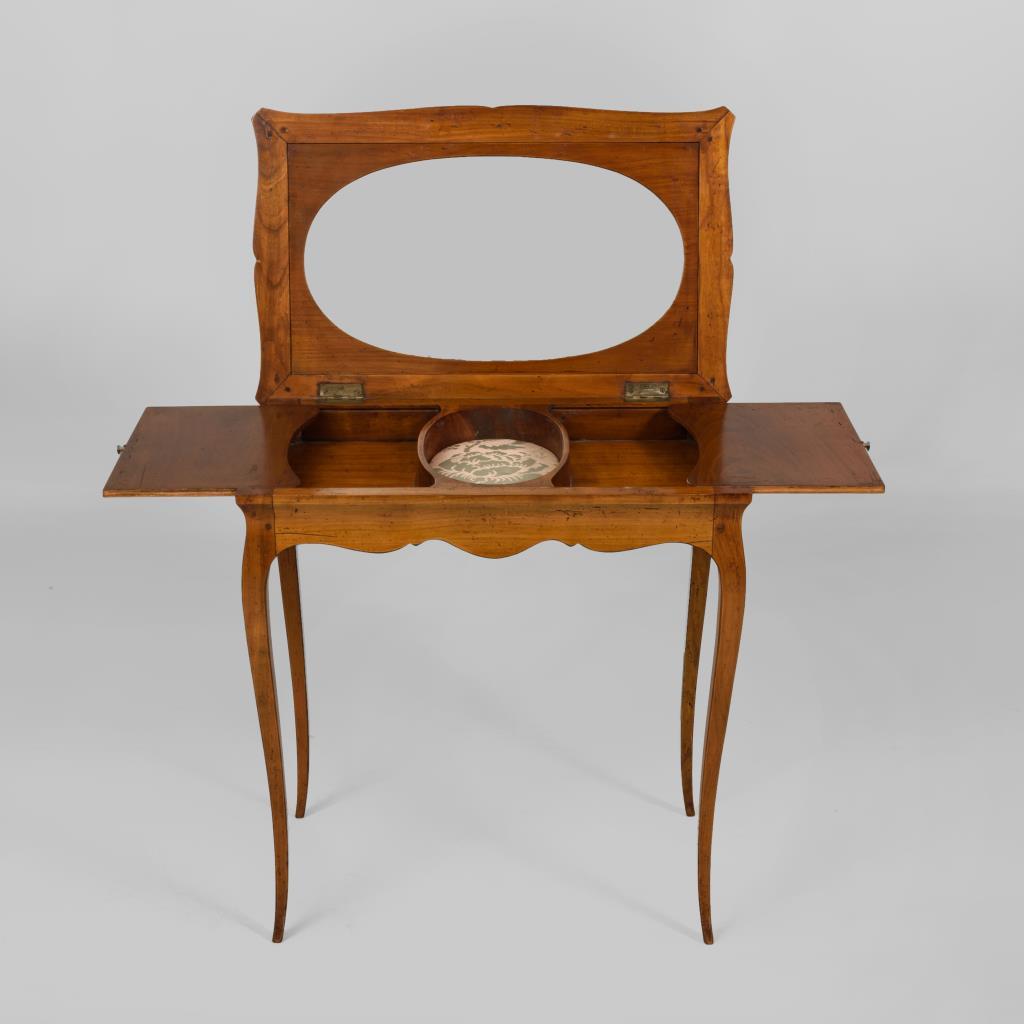 Kleiner Klapptisch mit dezent geschwungener Form und integriertem Spiegel im Innenteil, 2 verschließbaren Fächern mit seitlich herausziehbarem Deckel und 1 offenem, mit Stoff ausgekleidetem Fach. Inaktiver Anobienbefall, Gebrauchsspuren, Bodenplatte ergänzt.