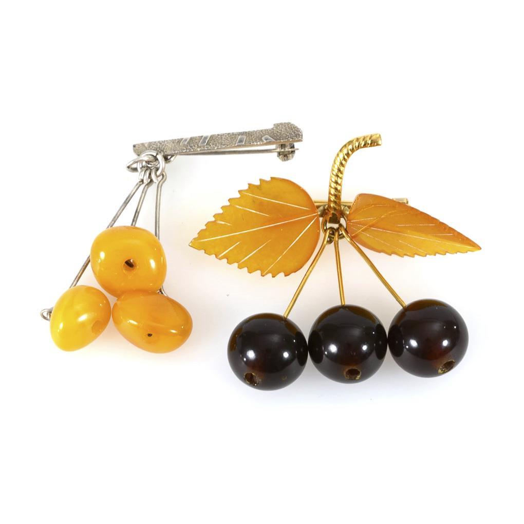 Kirschenbrosche mit Metallbroschierung und Nadel mit 3 Bernsteinabhängungen.
