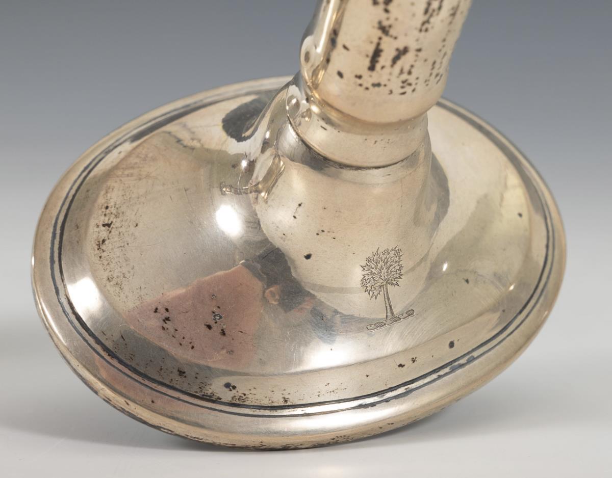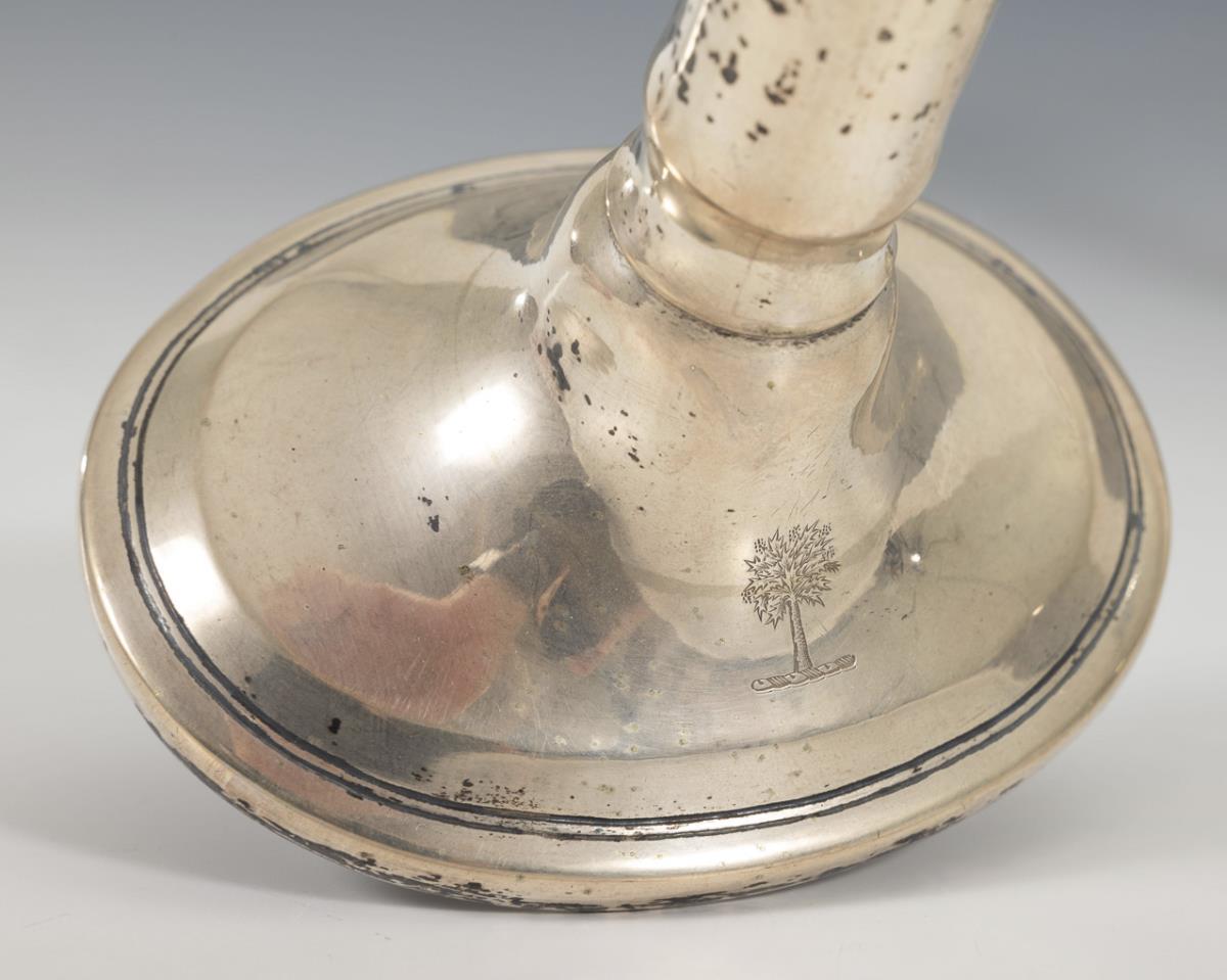 Silberleuchter in Säulenform mit ovalen Füßen; darauf je ein fein gravierter Baum. 1 Delle, einige Kratzer am Wachsteller, fleckig.
