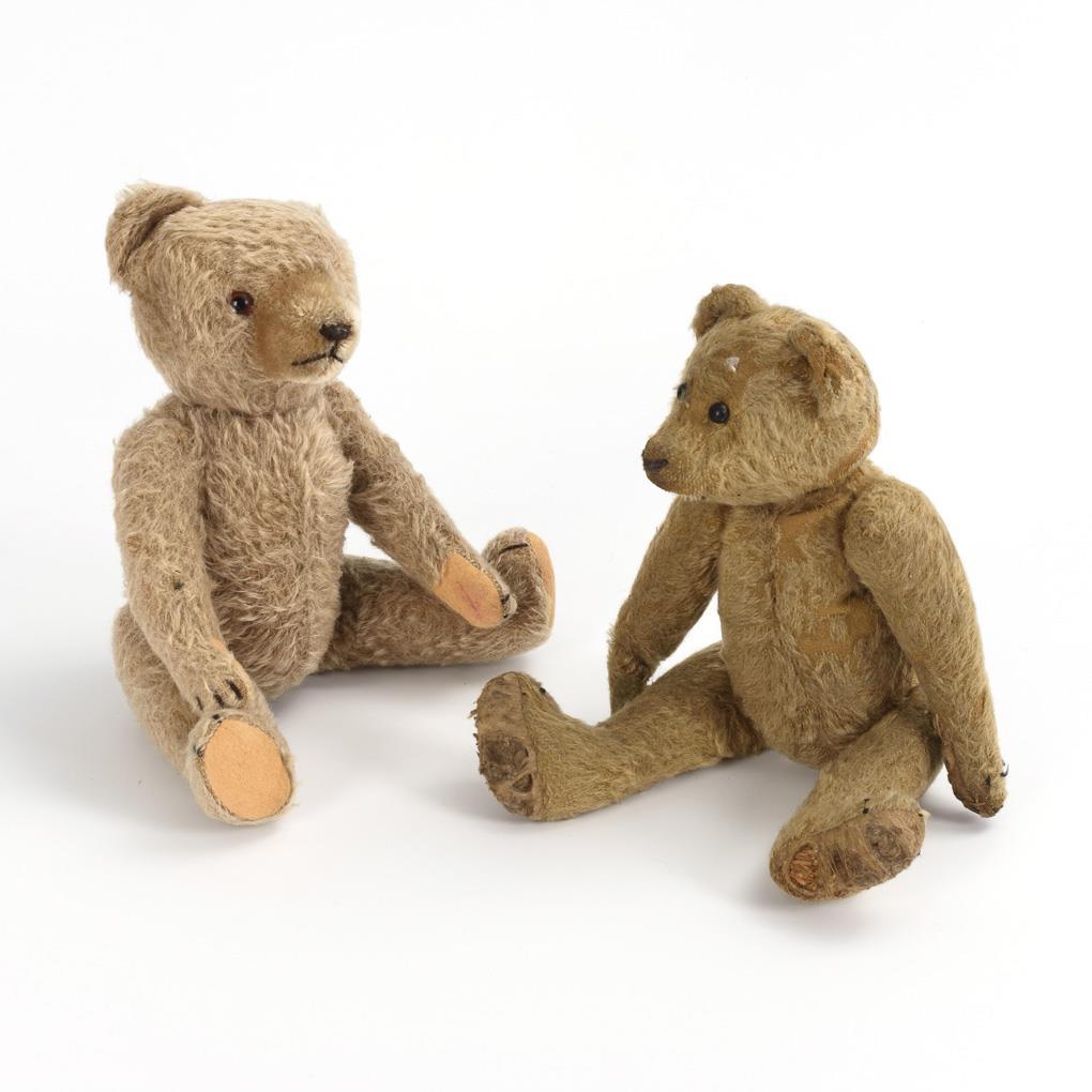 2 helle Teddys. 1x mit Schuhknopfaugen, 1x jünger mit intakter Stimme (wohl Hermann). Der ältere mit Kahlstellen und defekten Pfoten.