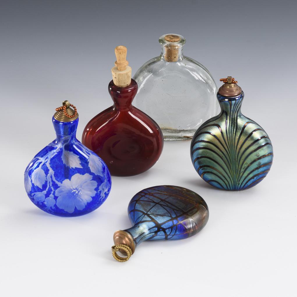 Kleine Plattflaschen. 1x aus farblosem, blasigen Glas. / 1x aus farblosem Glas mit rotem Innenfang. / 1x farbloses Glas mit aufgesponnenem Fadennetz aus farblosem Glas, irisiert. / 1x farbloses Glas mit silbergelben, fächerartig gekämmten Fäden, irisiert. / 1x Anfang 21. Jh., Wolfgang Schmid, signiert: aus farblosem Glas mit blauem Überfang und gravierten Rosenblüten. 1x am Stand bestoßen.
