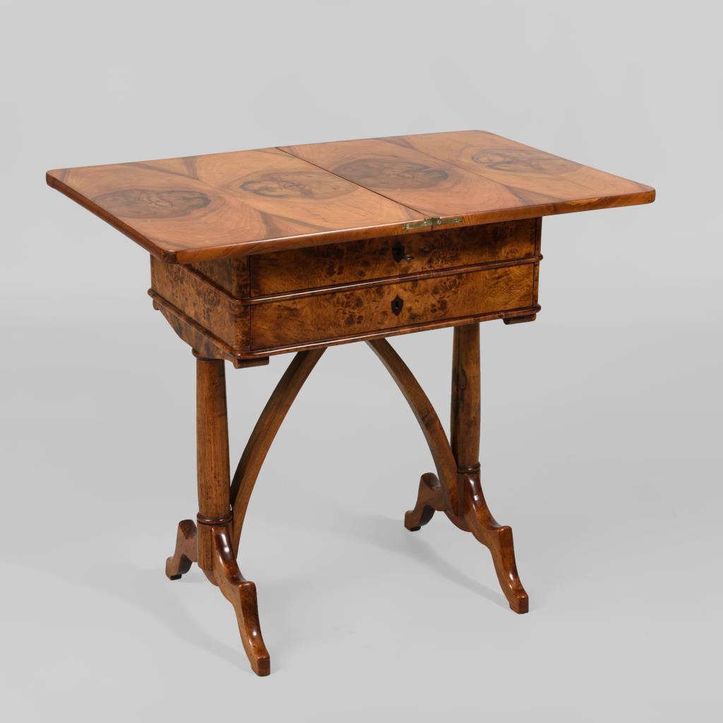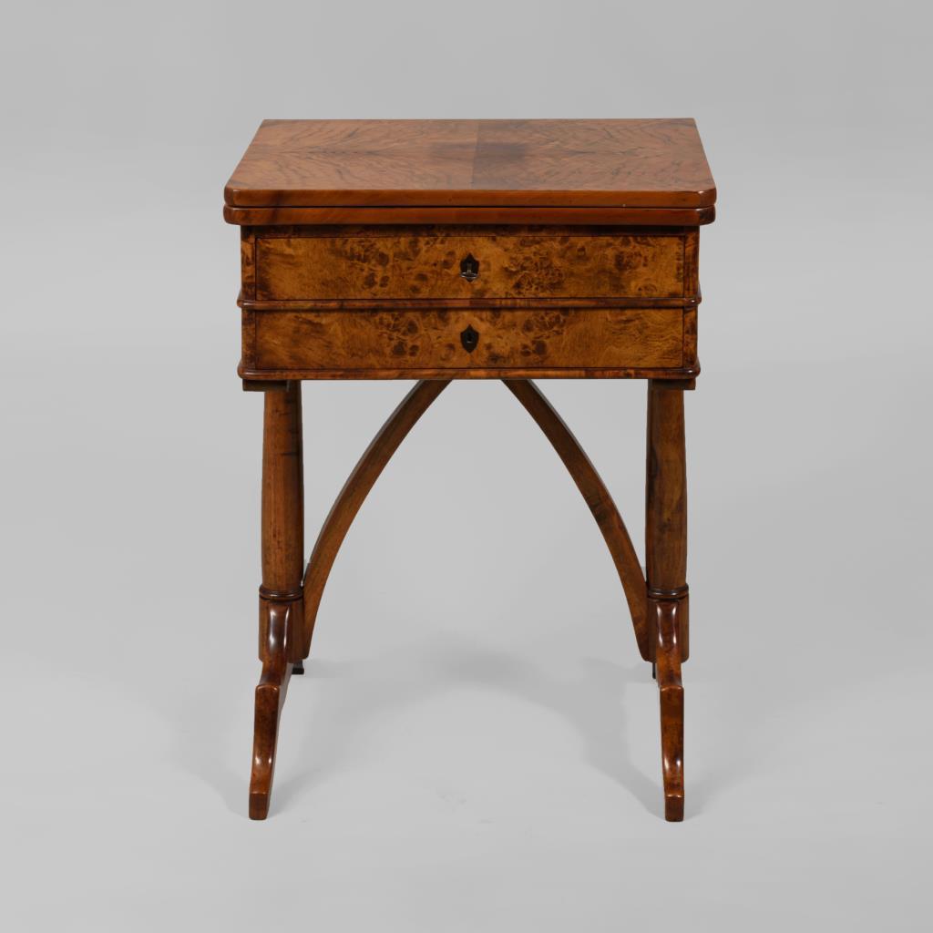 2-schübiger Nähtisch mit klappbarer Platte im Drehklapp-Mechanismus, auf verstrebten Brückenbeinen, dekoriert mit Maserfurnier, 1 innen gefächerter Schub mit teils herausnehmbaren Einsätzen. Wohnfertig restauriert.