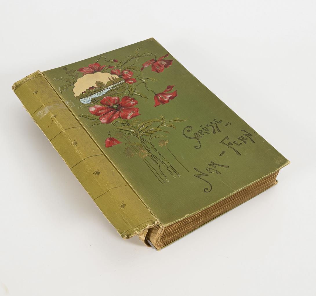 Karten aus Deutschland, darunter viele "Gruß aus ..." und Lithographien. Im grünen, defekten Album "Grüsse aus Nah und Fern" mit roten Mohnblumen.