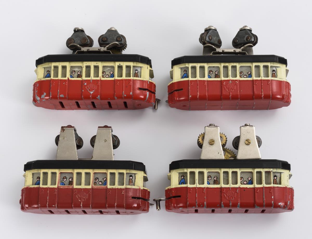 Nachbildung der Wuppertaler Schwebebahn. Modellbau-Bahn mit Trafo für Elektrobetrieb. Vollständigkeit und Funktion nicht geprüft. Anleitungsheft mit Feuchtigkeitsschaden, Altersspuren, Lackdefekte an den Waggons, Karton mit Defekten.