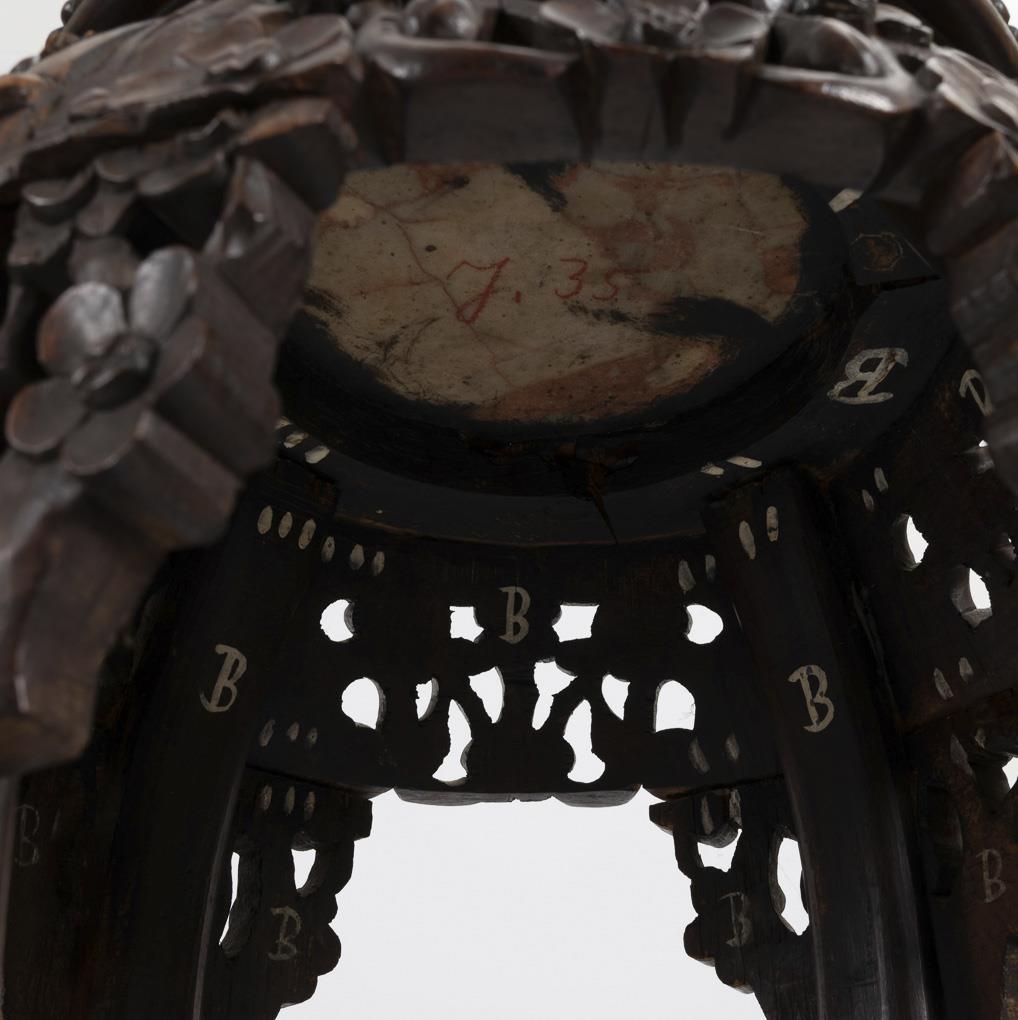 Geschnitzte und durchbrochen gearbeitete Zarge mit Prunusblüten Dieses Motiv auch auf den Außenflächen der geschwungenen Beine und dem unteren Kreuz. Eingelegte Marmorplatte. Kleiner Ausbruch in Marmorplatte und deren Holzfassung.