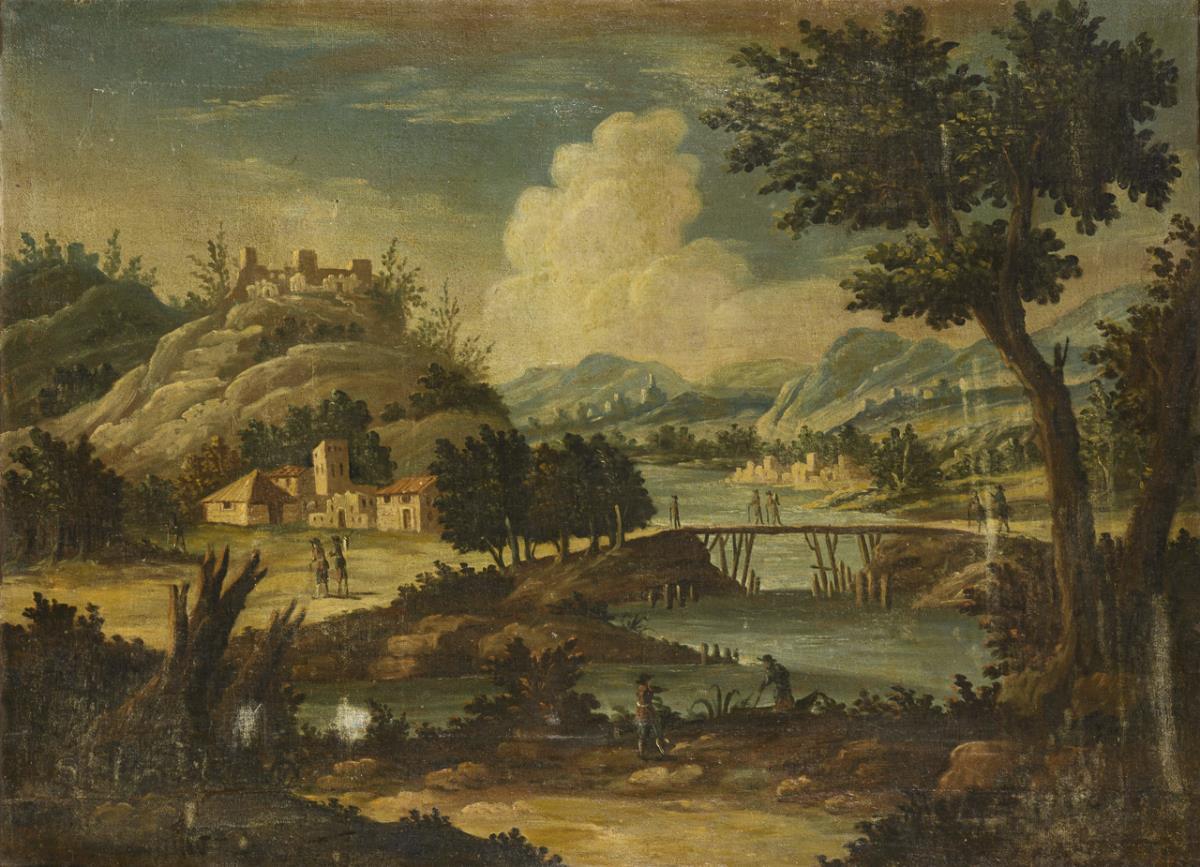 Flusslandschaft mit Staffagefiguren auf und nahe einer Brücke unterhalb einer Burgruine im Sonnenschein. Altersspuren.