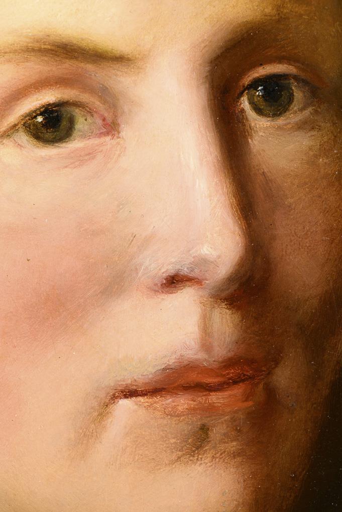 Bildnis der jungen Frau im gelben Gewand mit lockigem Haar vor dunklem Hintergrund. Leinwand wachsdoubliert.