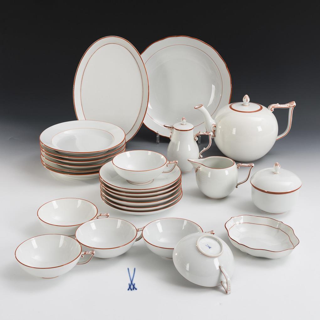 25 Teile. Teekanne (H 15 cm), Wasserkännchen (H 12,5 cm), Milchkännchen, Zuckerdose, 6 Teetassen, 6 Untertassen, 6 Frühstücksteller, 1 Schale (Ø 25 cm), 1 Ovalplatte (L 26,5 cm) und 1 Vierpassschälchen (L 14,5 cm).