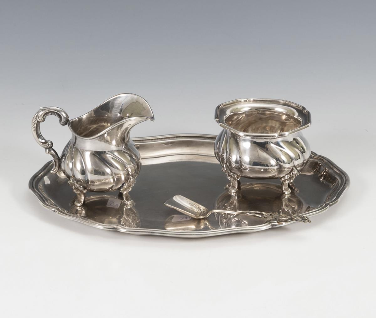 Zucker-Sahne-Set auf Tablett, dazu Zuckerlöffel. Dresdner Silberwarenfabrik.