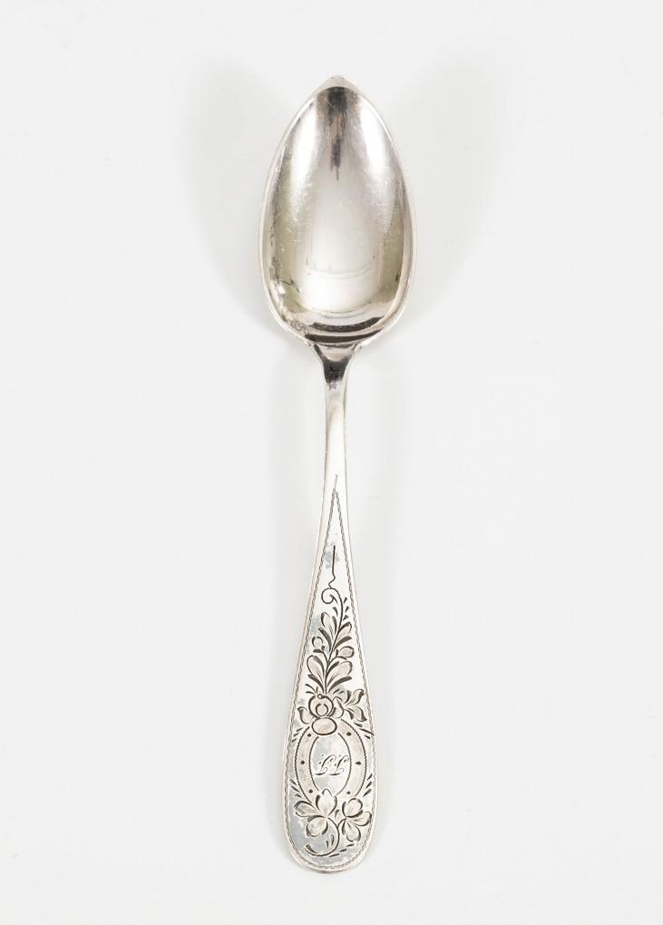10x mit Maiglöckchengravur und Monogramm "EM", verso "GE". 1x leicht abweichend mit Monogramm "FF".