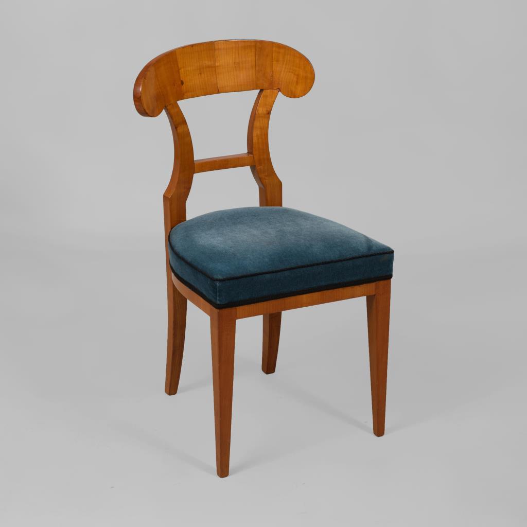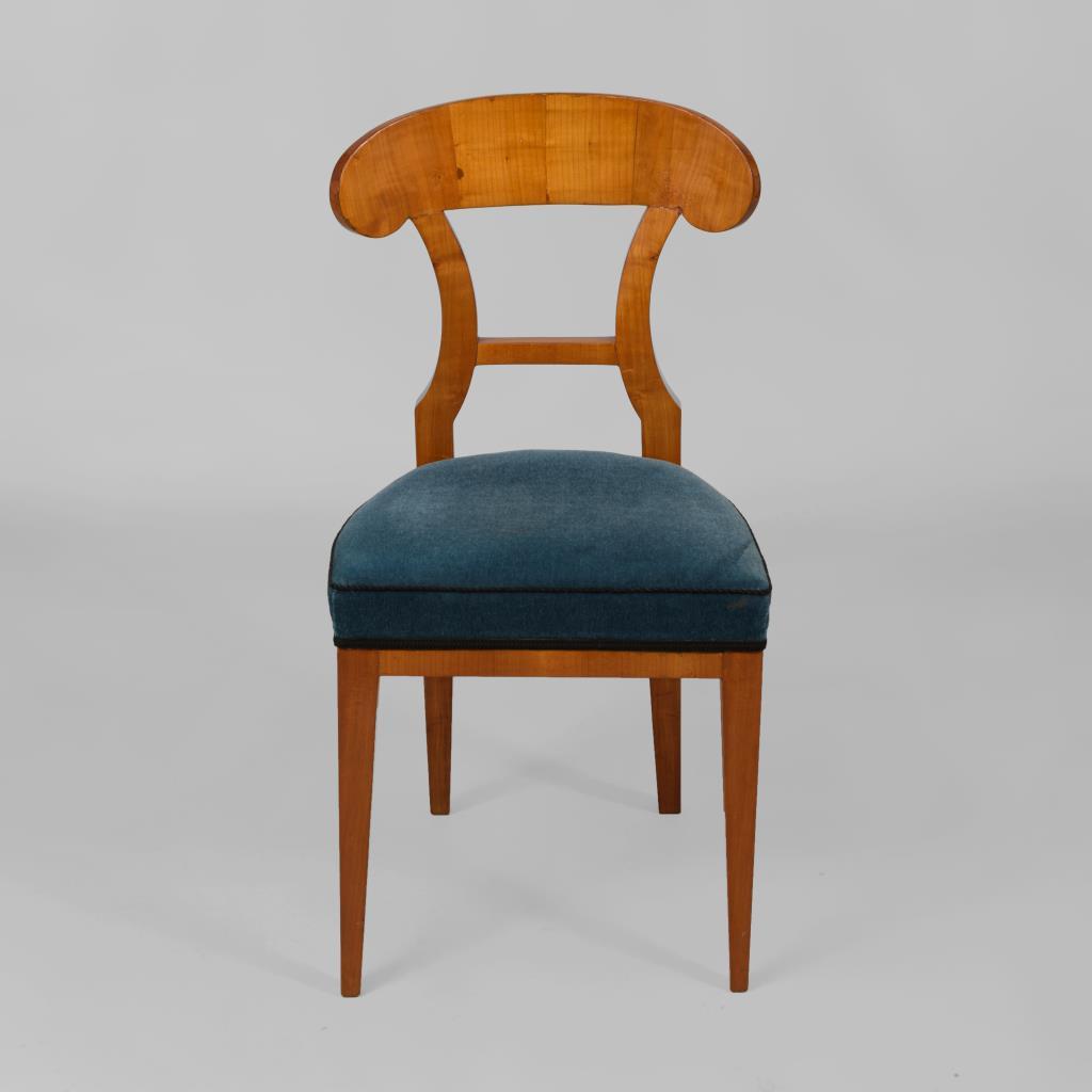 Polsterstuhl mit schaufelförmiger Rückenlehne und 4 Pfeilerbeinen, Polster mit blauem Samtbezug. Restauriert, Furnier mit leichten Defekten, Polster und Bezug ergänzt.