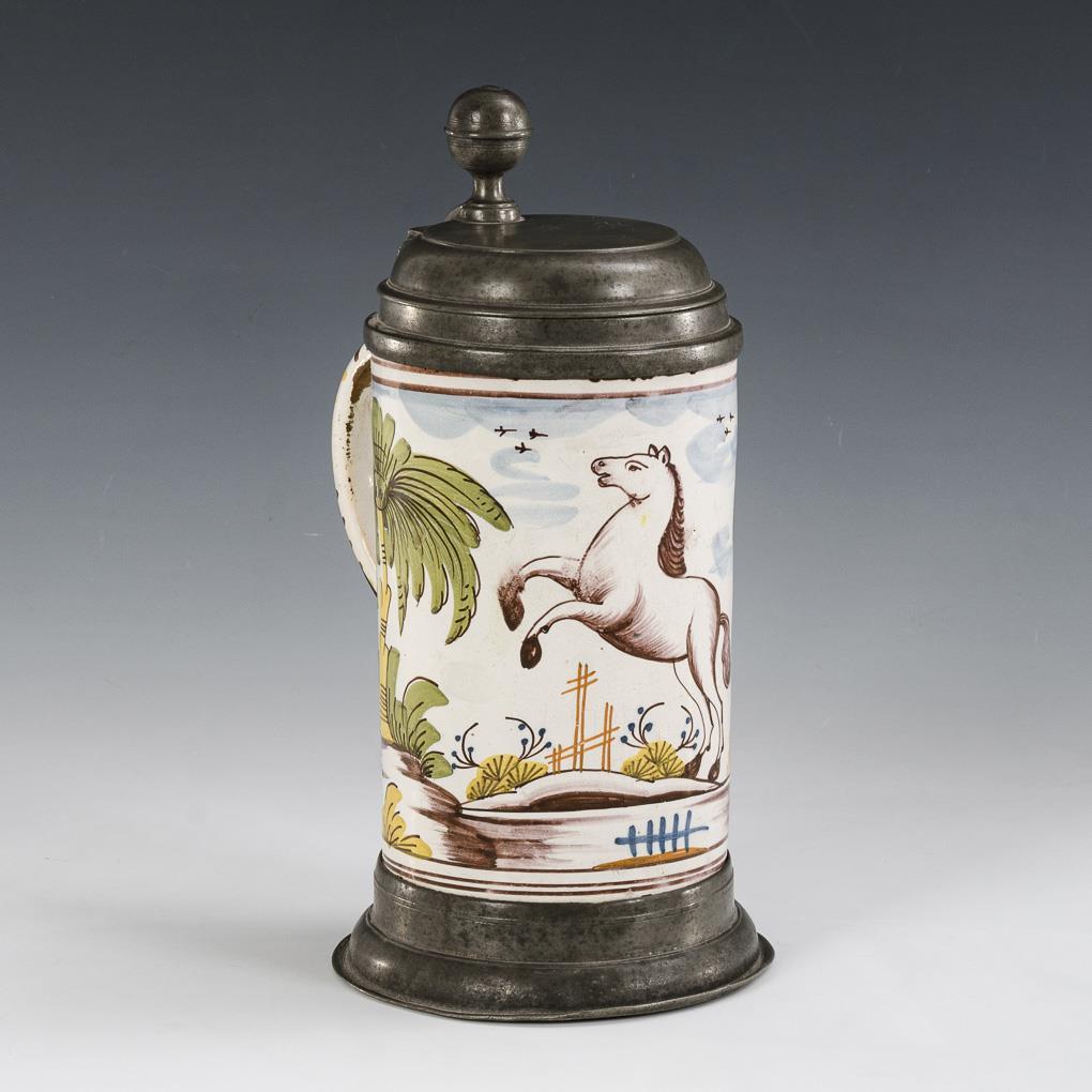 Zylinderkrug mit strichverziertem Bandhenkel. Schauseitig ein springendes Pferd zwischen Palmbäumen. Zinndeckel mit Kugeldrücker, graviert "JGH", Henkelband und Zinnstand. Wandungs- und bodenrissig, 1 Riss am Henkelansatz, leicht glasurberieben.