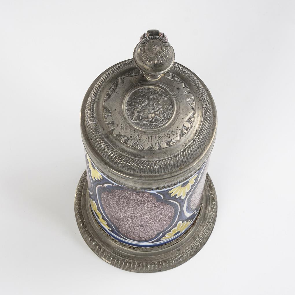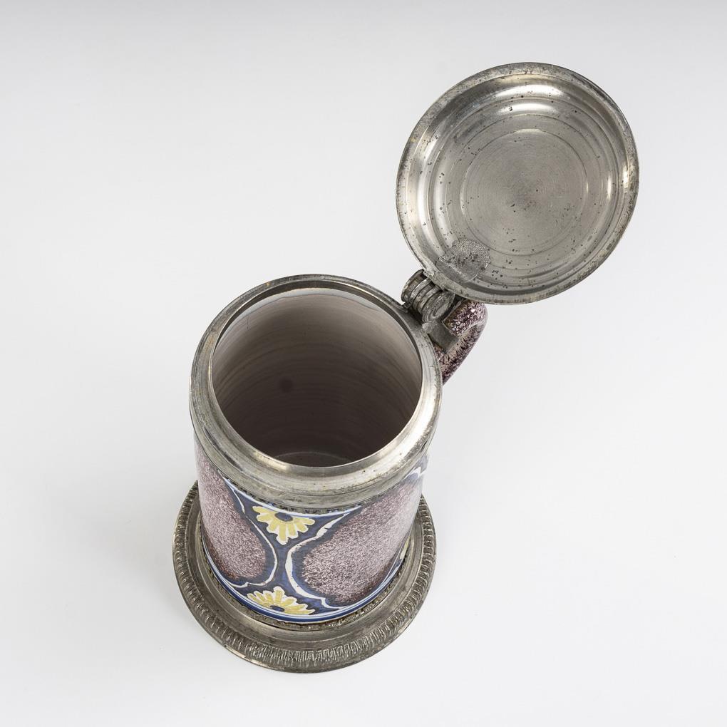 Zylinderform mit Bandhenkel und reicher Zinnmontierung. Profilierter Deckel mit Kugeldrücker, Reliefplakette mit Putten, graviert "MMW 1760", Henkelband, Zinnstand. Leichte Alters- und Gebrauchsspuren, partiell minimal glasurrissig.