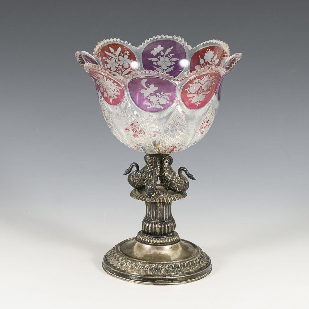 Geschliffene Glasschale in Blütenform, mit purpur und violett überfangenen Blütenmedaillons. Auf reliefiertem Schwanenfuß. Kleine Randbestoßungen.