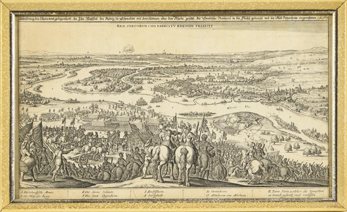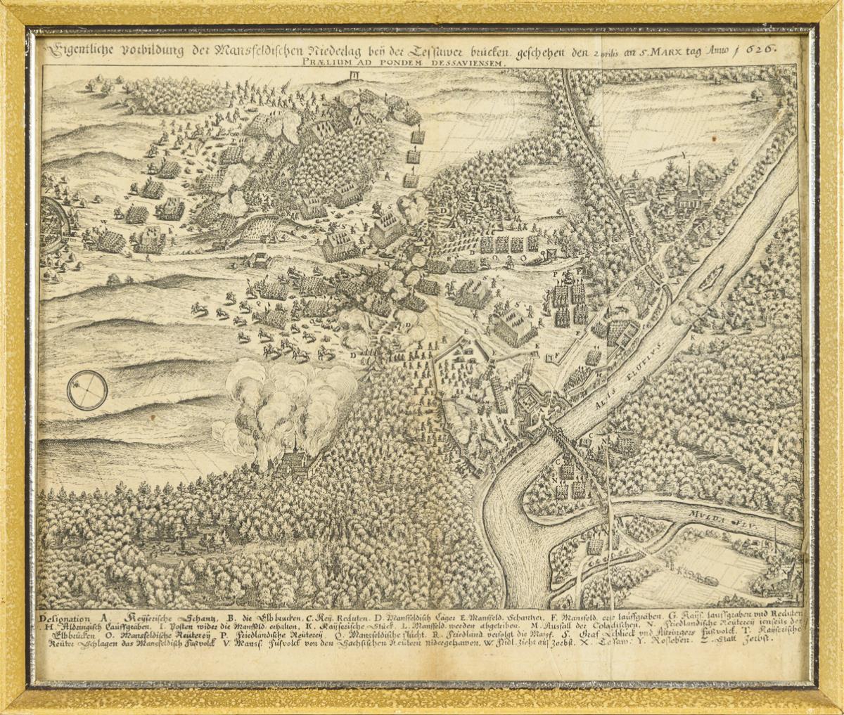 Historische Darstellung der Kriegsflotte der Venetianer in der Seeschlacht gegen die Türken in den Dardanellen "Vera delineatio ordinis bellique naualis Venetorum cum Turcis apud Dardaneli. Eigentlicher Abriß der Ordnung vnd Schiffstreits der Venetianer mit den Türcken in der Enge bey Dardaneli Anno 1646", gerahmt & hinter Glas: 31,5 x 34 cm, stockfleckig, Bugfalten, Ecke unten rechts abgerissen | Historischer Befestigungsplan mit Darstellung der Schlacht bei Dessau im Jahr 1626 während des Dreißigjährigen Krieges von 1618 - 1648: "Eigentliche Vorbildung der Mansfeldischen Niderlag bey der Tessauer Brücken, geschehen den 25. Aprilis an S. Marx tag. Anno 1626", gerahmt & hinter Glas: 31 x 36,5 cm, Bugfalten, verschmutzt; aus "Theatrum Europaeum" | Historische Darstellung des Reichtages im Reichssaal, mit zusätzlich montierter Legende, betitelt "Eigentlicher Abriß der Reichstags-Solennitet : so den 3., 13. Sept. diß 1640 Jahrs in Regenspurg bey eröfnung d' proposition angestelt und gehalten worde", gerahmt & hinter Glas: 34,5 x 33 cm, stockfleckig, Bugfalten, hinterklebte Risse | Historischer Befestigungsplan mit Darstellung der Schlacht bei Tuttlingen im Jahr 1643 während des Dreißigjährigen Krieges von 1618 - 1648, betitelt: "Eigentliche Delineation welcher gestalt, die Frantzesisch-Weinmarischen Armee bey und in Tutlingen im Thonauthal [...]" , gerahmt & hinter Glas: 32 x 41 cm, Bugfalten, griffspurig | Historischer Befestigungsplan mit Darstellung der Schlacht bei Breitenfeld im Jahr 1642 während des Dreißigjährigen Krieges von 1618 - 1648, betitelt: "Eigentliche Abbildung des Haupt Treffens zwischen den Kays. und Schwedischen Armeen den 23 Octobr. und 2. Nouemb. 1642 bey Leipzig geschechen", mit zusätzlich montierter Legende, gerahmt & hinter Glas: 35,5 x 42 cm, Bugfalten, stockfleckig, griffspurig | Historischer Befestigungsplan mit Darstellung der Schlacht bei Oppenheim im Jahr 1631 während des Dreißigjährigen Krieges von 1618 - 1648, betitelt: "Abbildung des Ohrts und gelegenheit, da Ihr Maystat der König zu Schweden mit dero Armeen über den Rhein gesetzt, die Spanische Reuterei in die Flucht gebracht und die Statt Oppenheim eingenohmen 7. 9bris. 1631", gerahmt & hinter Glas: 22,5 x 36 cm, etwas stockfleckig, griffspurig.