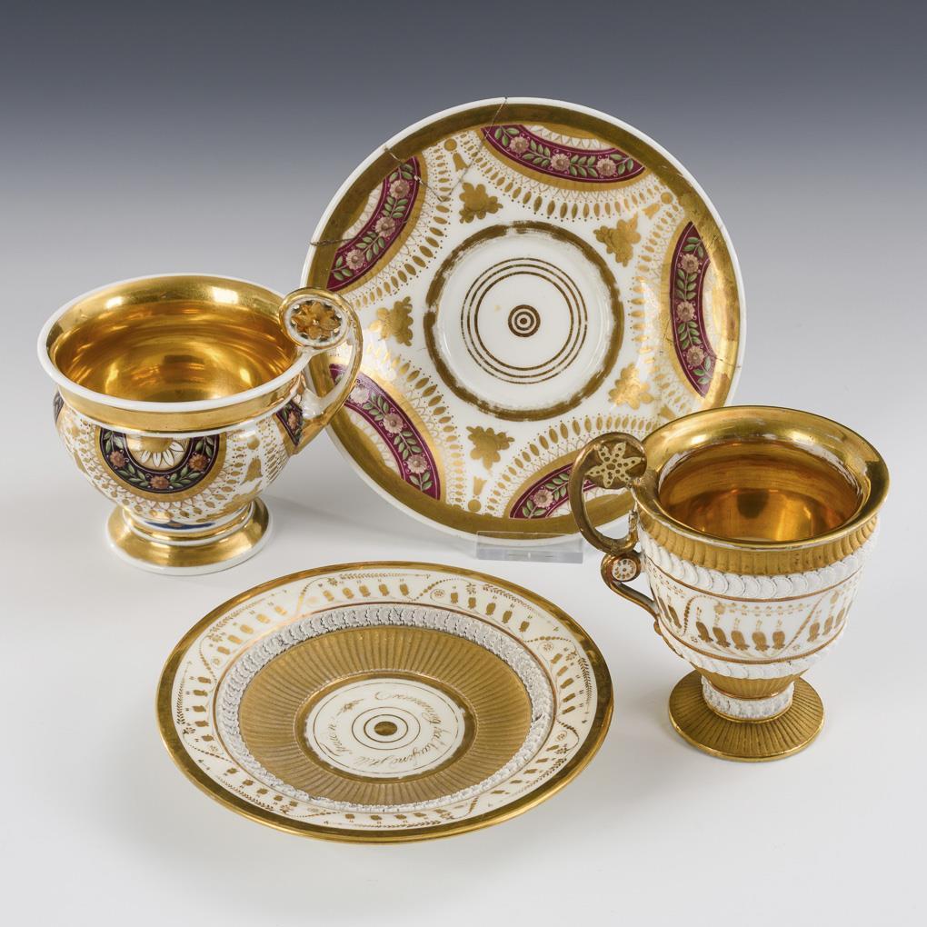 1x polychrom bemalt, beide goldstaffiert. H Tassen 11,5 und 12 cm, Ø originale Untertassen 15,5 und 17 cm.