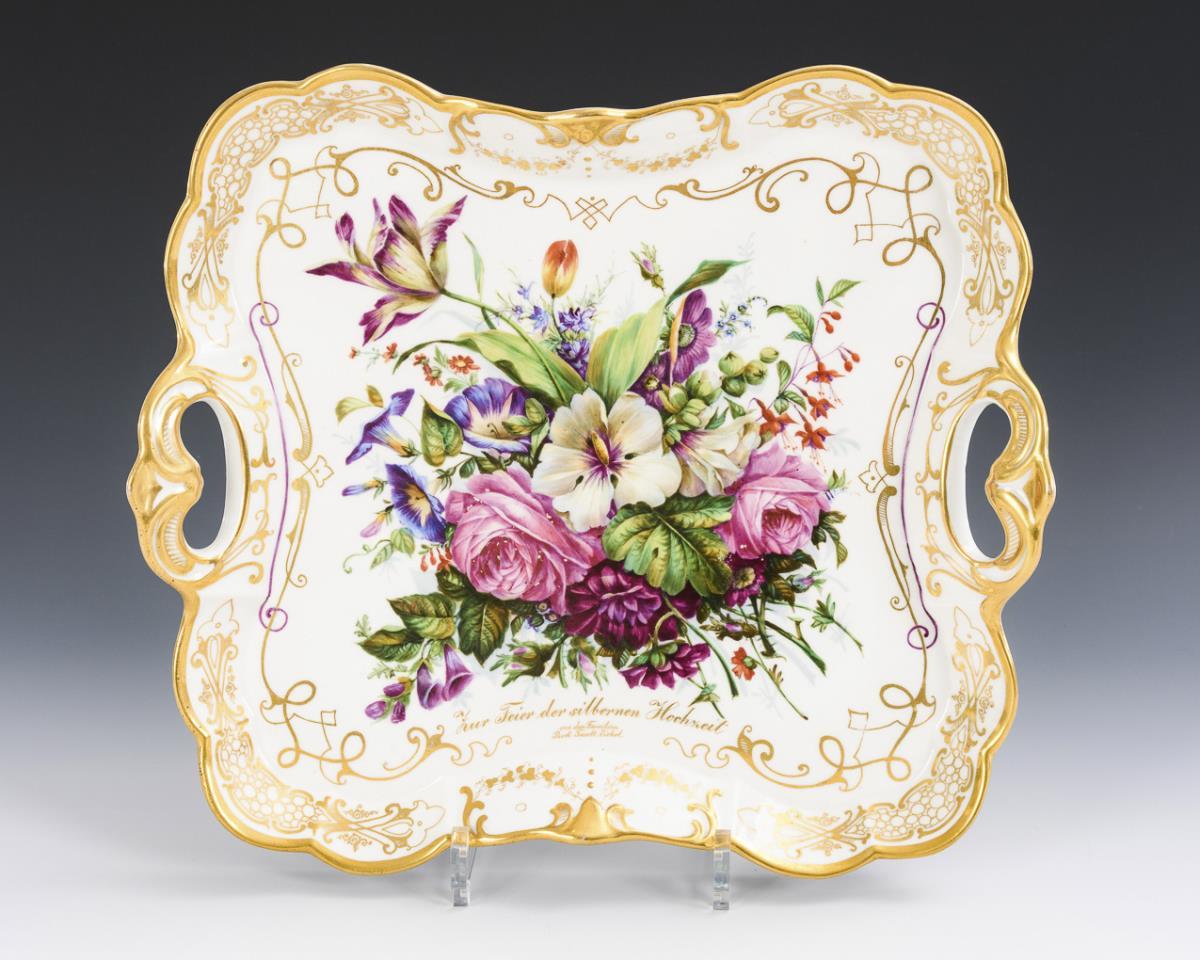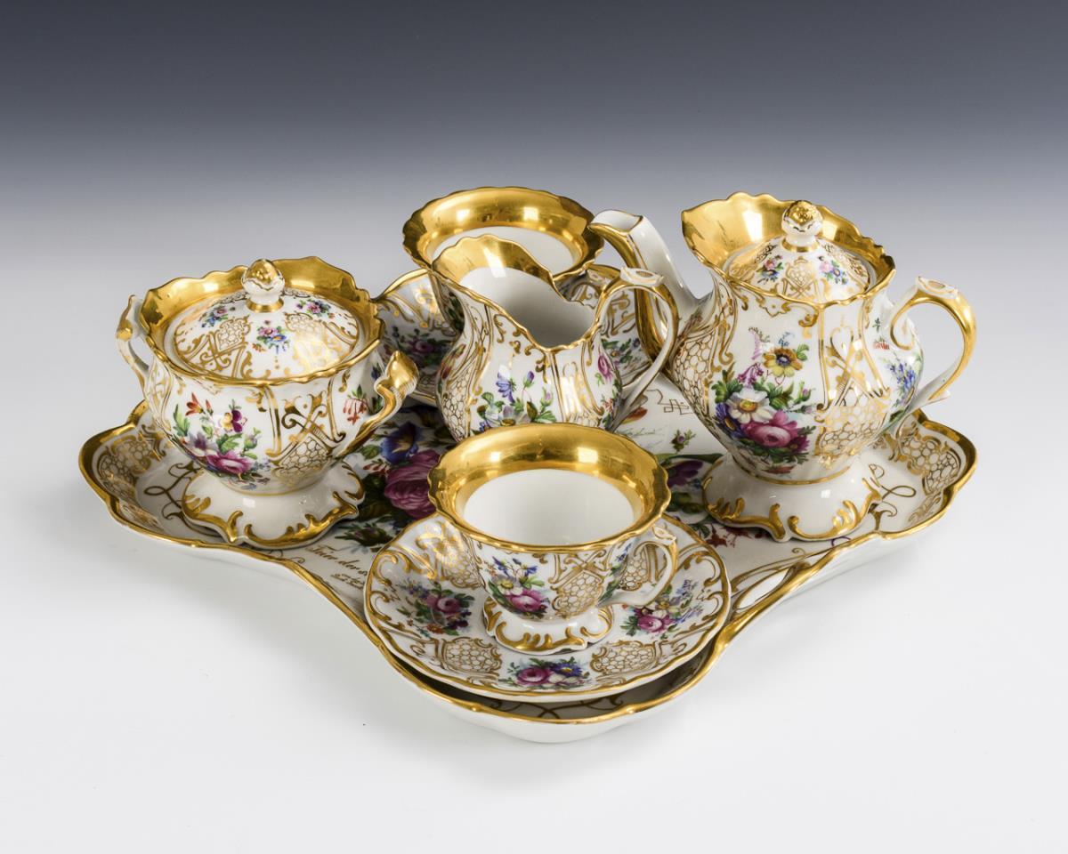 8 Teile. Rocailleformen mit leuchtend farbigen Blumenbuketts und reicher Goldmalerei. Auf dem Tablett bezeichnet "Zur Feier der silbernen Hochzeit von den Familien Bock. Fasolt. Eichel". Kaffeekanne (H 14 cm), Milchkännchen (H 11 cm), Zuckerdose (H 11,5 cm), 2 Tassen (H 6,5 cm), 2 Untertassen (Ø 14,5 cm) und quadratisches Tablett (33,5 x 30 cm). Auf dem Tablett minimale Farbabplatzer, 1 Zuckerdosenhenkel geklebt, geklebter Ausbruch an 1 Tassenstand.