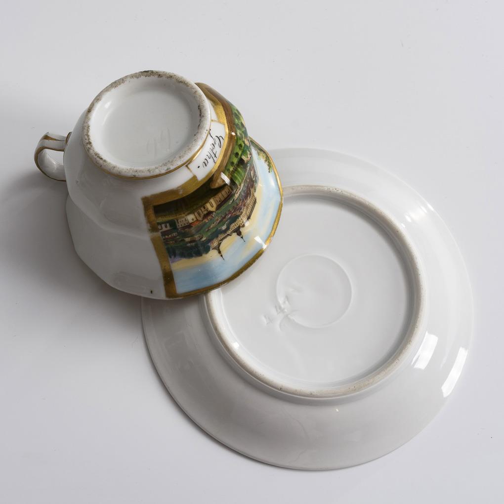 Polychrom bemalt, goldstaffiert. H Tasse 6 cm, Ø ergänzte Untertasse 14 cm.