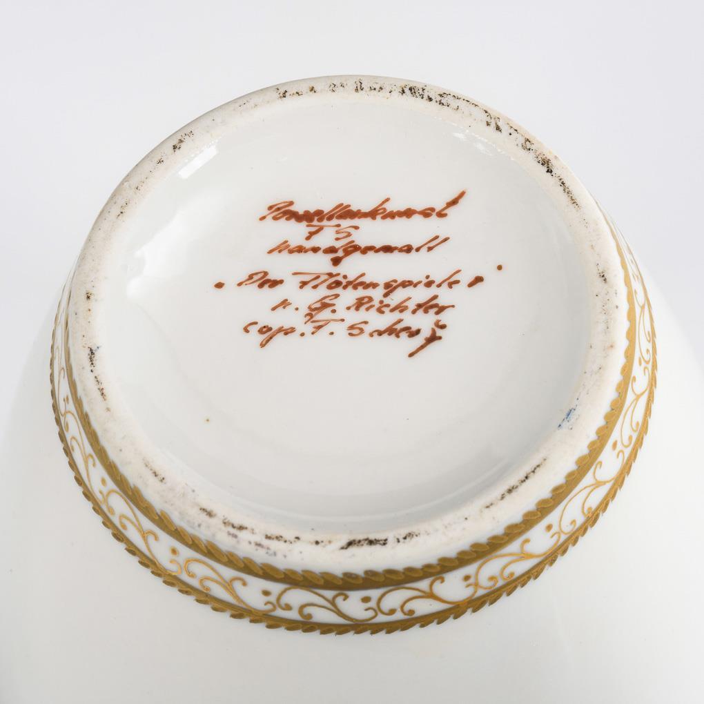 Ungemarkt, 1. H. 20. Jh.; unterseitig bezeichnet "Porzellankunst FS handgemalt 'Der Flötenspieler' n. G. Richter cop. F.Scherf". Signiert "cop. F. Scherf".
