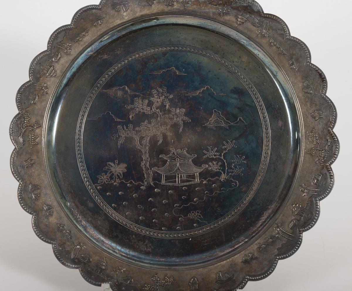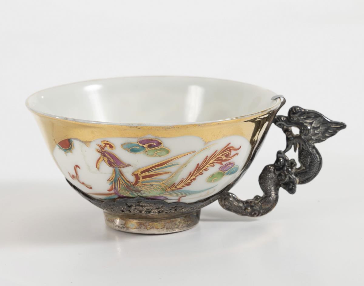 Asiatische Porzellantasse mit Silberhenkel, silberne Untertasse und versilberter Teller.