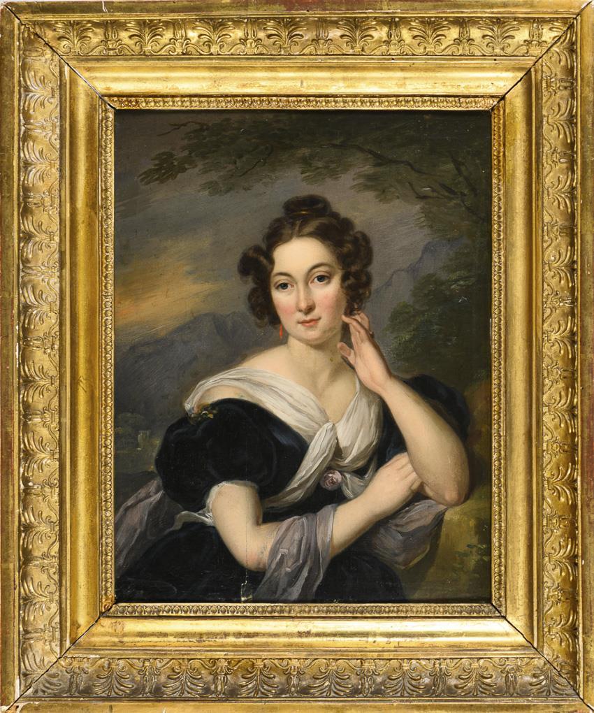 Bildnis einer jungen Dame im dunklen Kleid mit gelocktem Haar und nachdenklichem Blick vor Gebirgslandschaft. Altersspuren.