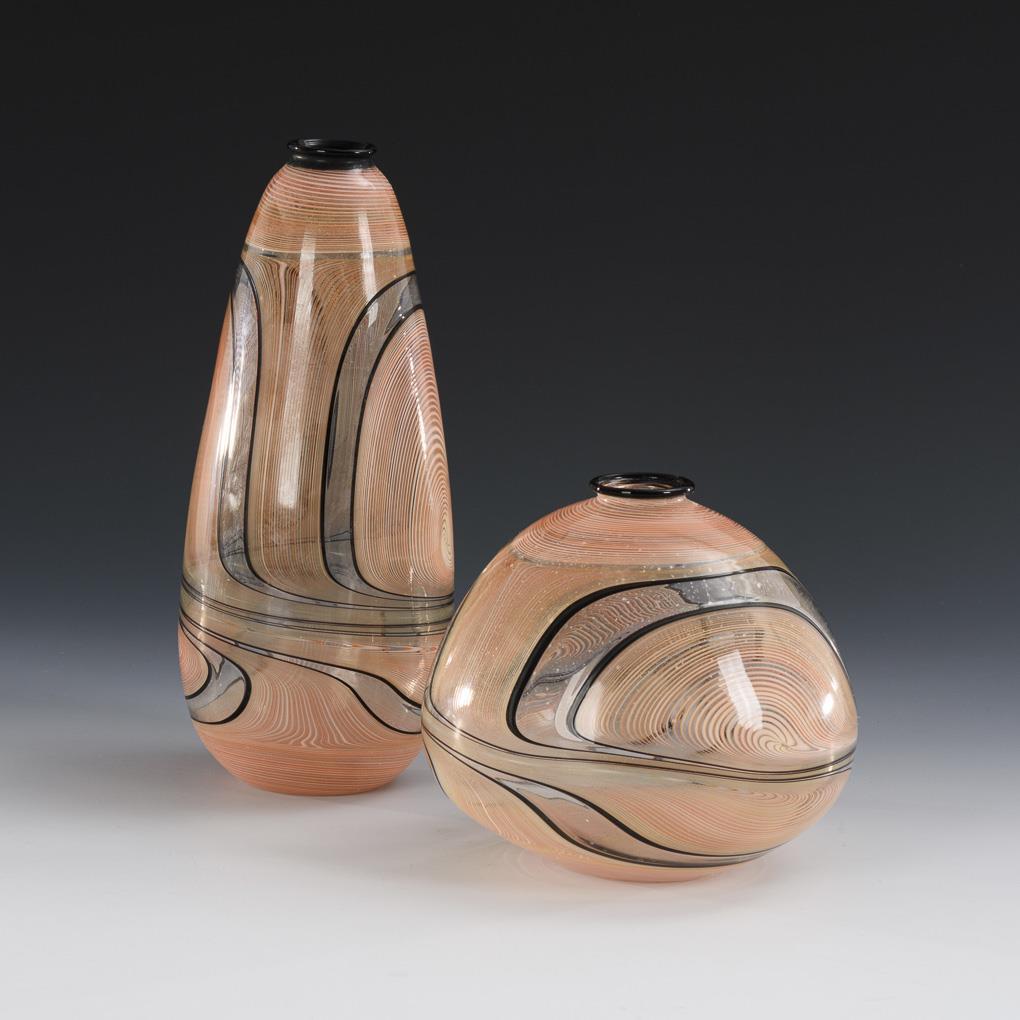 Montiertes und vor der Lampe geblasenes farbloses Glas mit opakschwarzen Fäden und opalweiß-roten Fadeneinschmelzungen. H 12 und 22 cm.