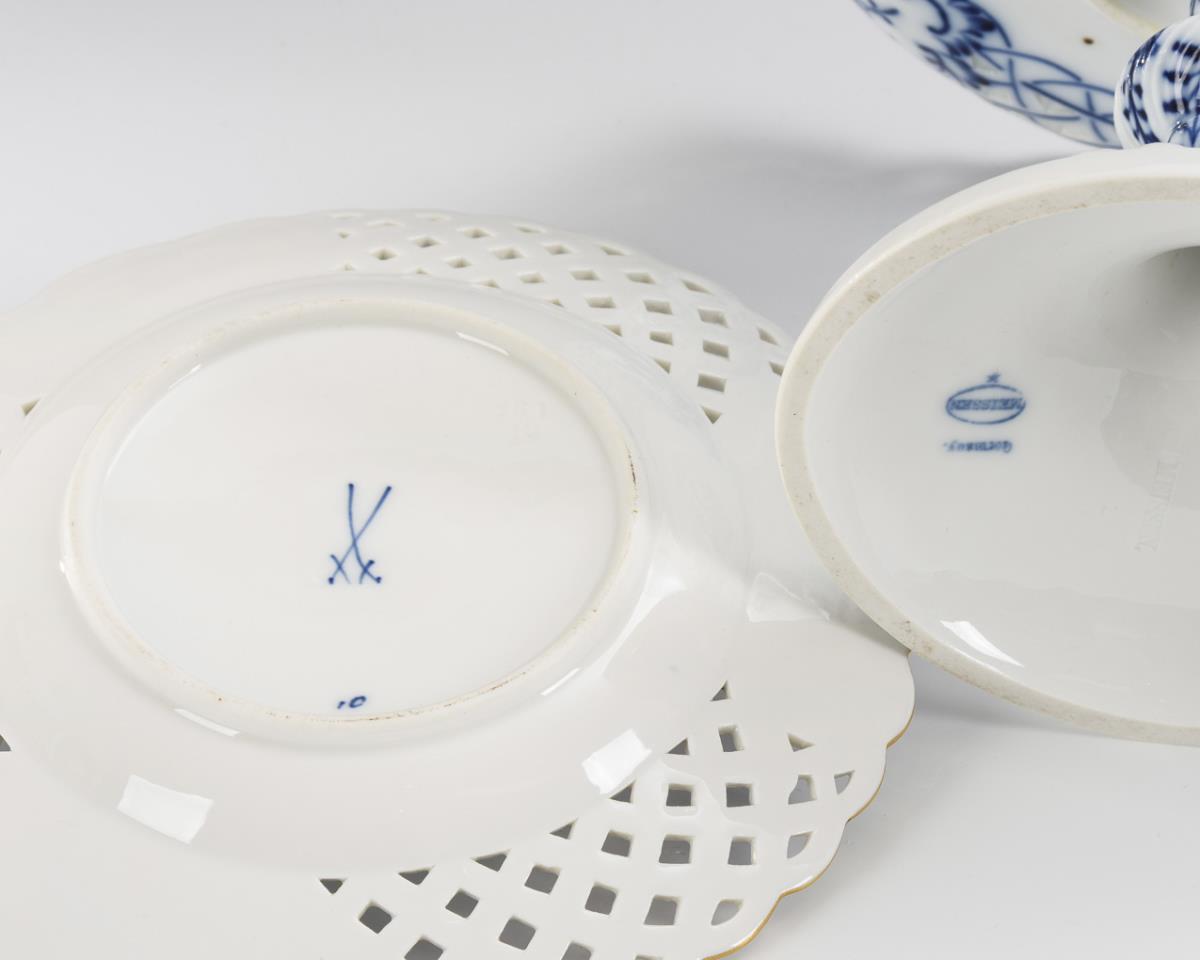 Unterglasurblaue Malerei, 1x mit Goldrand. Tafelaufsatz (H 21 cm), Durchbruchteller (Ø 20 cm).