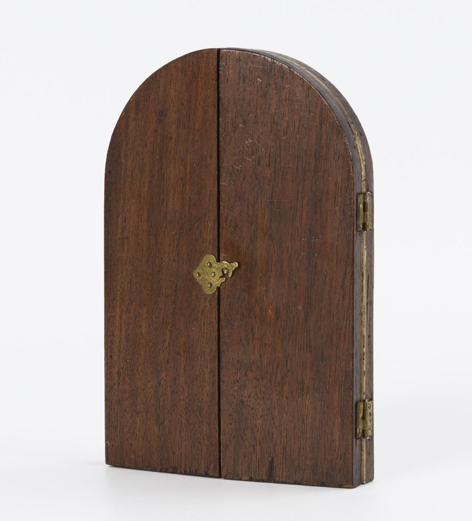 Mahagoni massiv, polychrom bemalte Bein-Inkrustation. Aufgeklappt 20 x 26 cm.