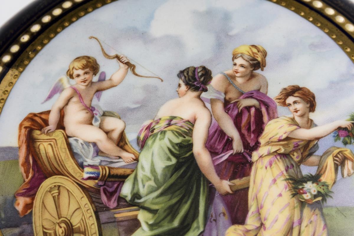 Gedrückte Dose mit Kobaltfond und reicher, ornamentaler Goldstaffage. Auf dem Deckel die Darstellung dreier Grazien, einen Wagen mit Amorknaben ziehend. Gold berieben.