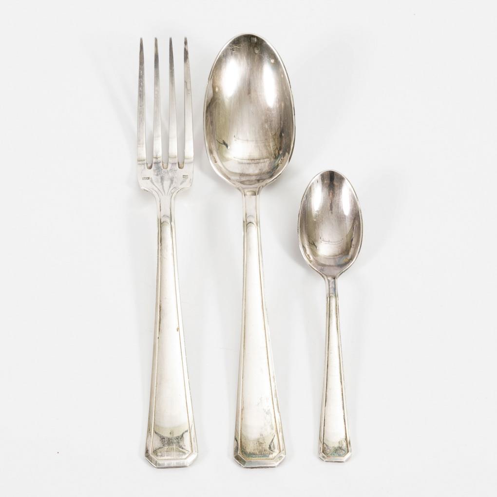 Suppenlöffel, Gabel und Teelöffel in gerader Form mit geschrägten Ecken. Minimale Altersspuren.