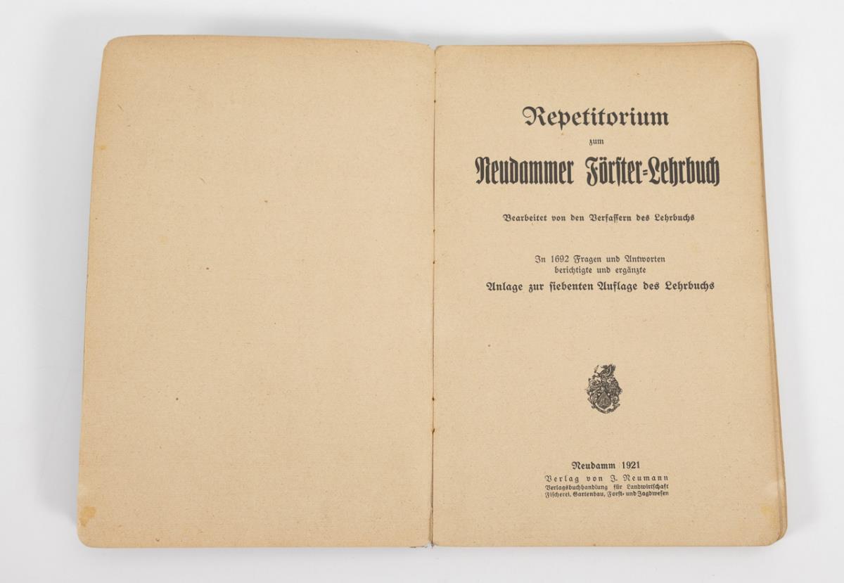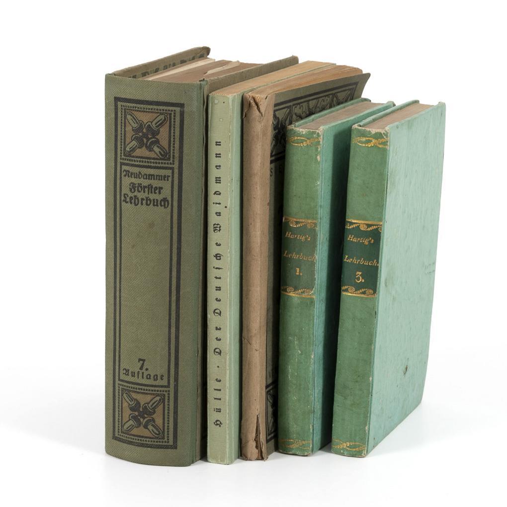 Hartig, G.L.: "Lehrbuch für Förster" 1816/17, Band 1 und 3, Stuttgart und Tübingen in der Cottaschen Buchhandlung, 232 und 247 Seiten. / "Neudammer Förster-Lehrbuch", 1922. Ein Leitfaden für Unterricht und Praxis sowie ein Handbuch für den privaten Waldbesitzer. 950 Seiten (einige wenige Seiten lose). Dazu "Repetitorium", 178 Seiten. / Hülle, Friedrich: "Der Deutsche Waidmann", Verlag J. Neumann, 1941, 179 Seiten, Broschur. Alle mit altersgemäßen Gebrauchsspuren.