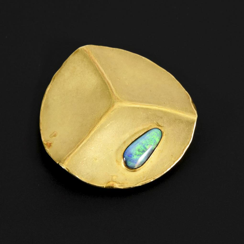 Satinierte Scheibe mit zargengefasstem Opalcabochon mit blau/grünem Farbenspiel. Kugelhaken, 3 starre Ösen.