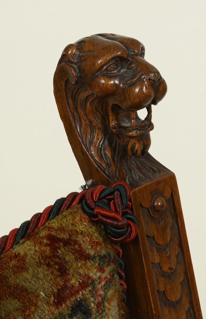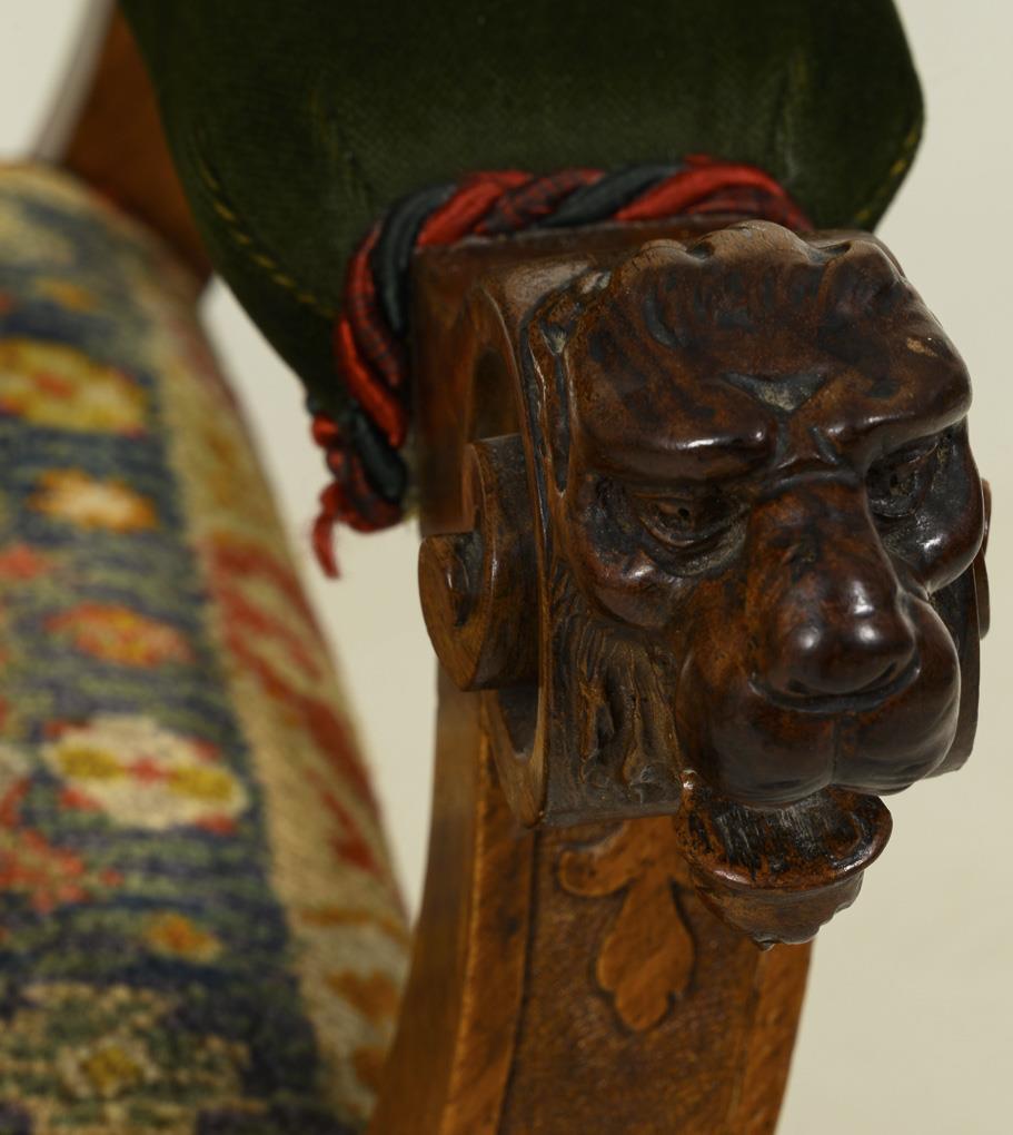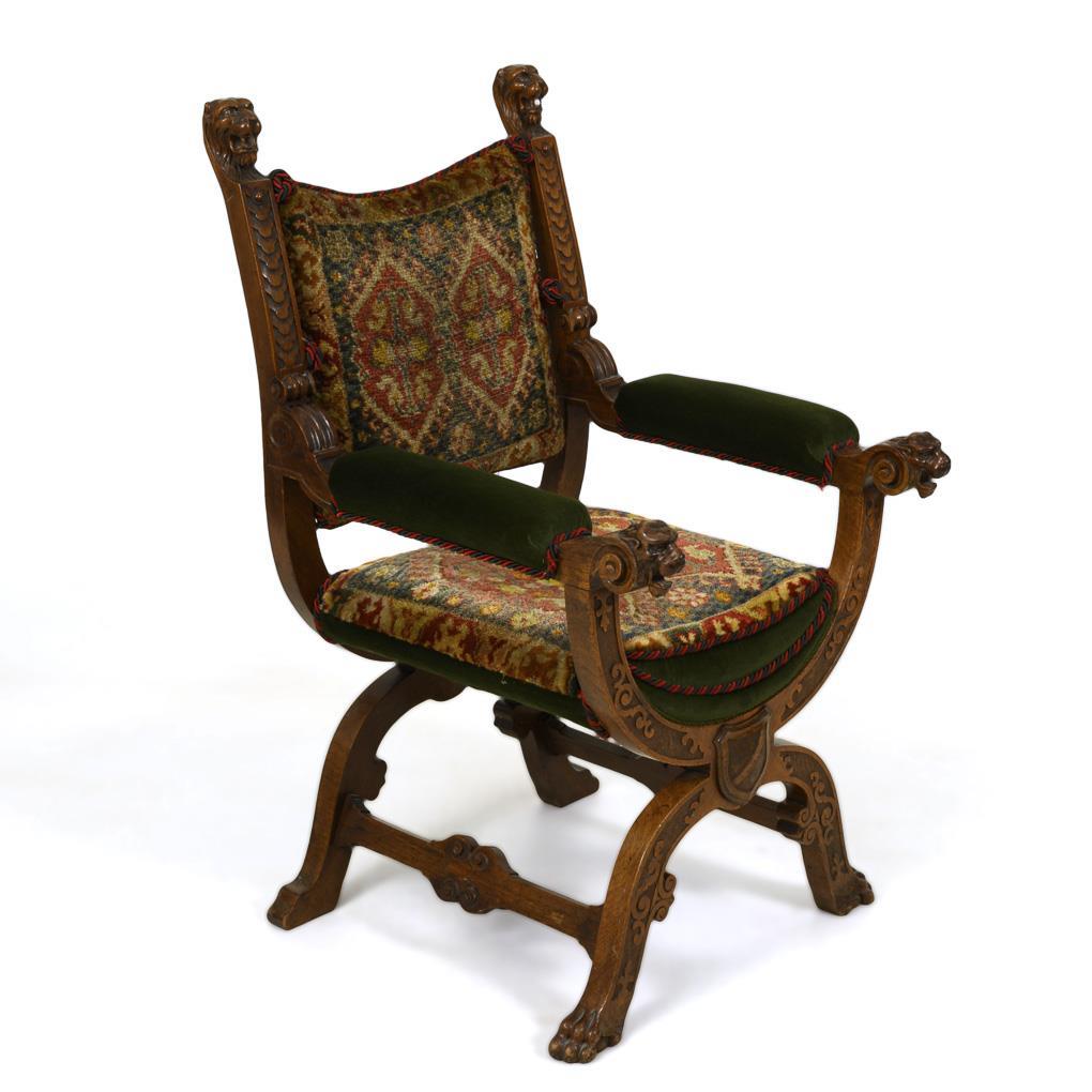 Gepolsterter Scherenarmlehnstuhl im Stil der Renaissance, verziert mit Reliefschnitzereien und plastischen Löwenköpfen; Bezug im Stil eines ornamentalen Knüpfteppichs und aus grünem Samt, verziert mit umlaufender, farblich passender Kordel. Alters-/Gebrauchsspuren, Polster und Bezug ergänzt.