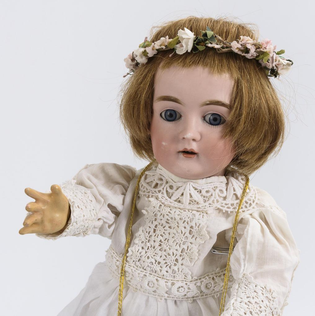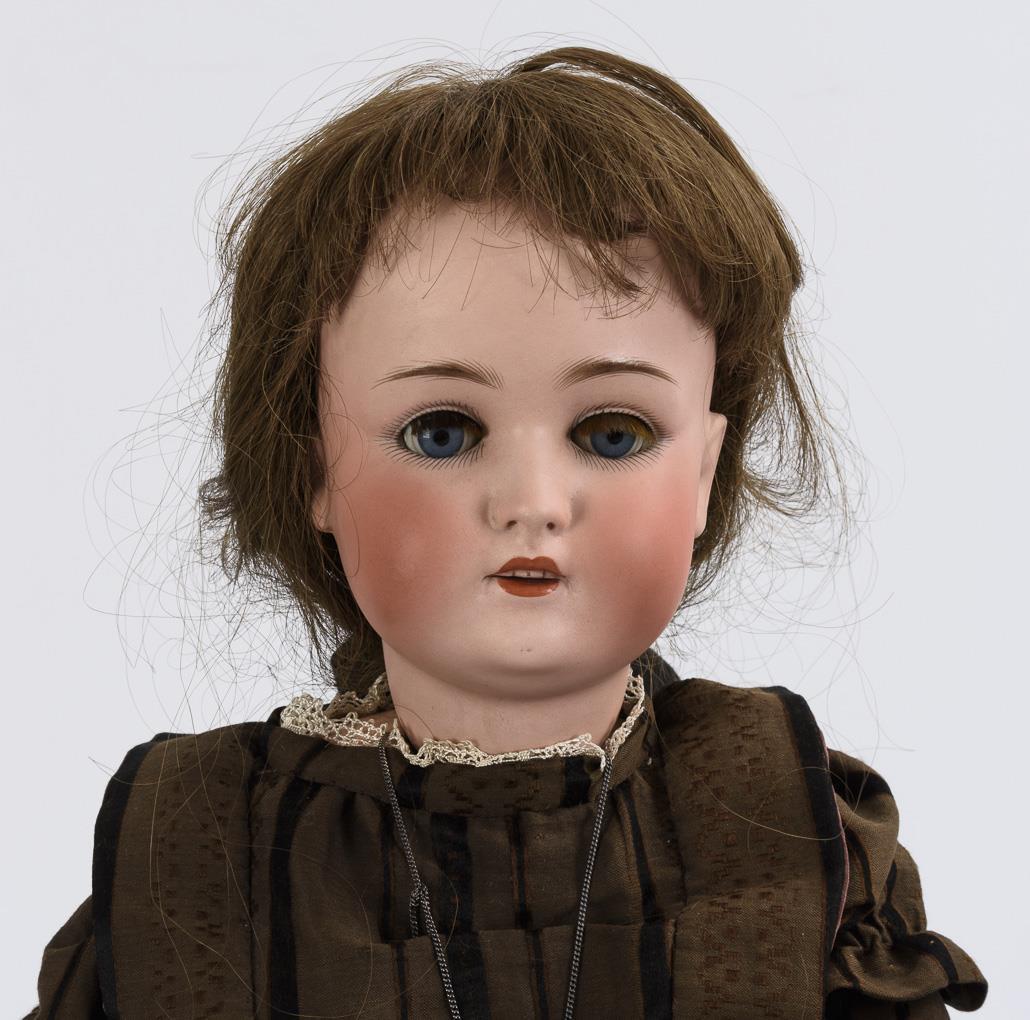 Beide mit Kurbelkopf, blauen Augen, Echthaarperücke und 15-teiligem Gliederkörper. 1x braunes Kleid, 1x weißes Kleid. 1x mit Haarriss-Spinne an der Stirn, 1x mit übermaltem Körper.