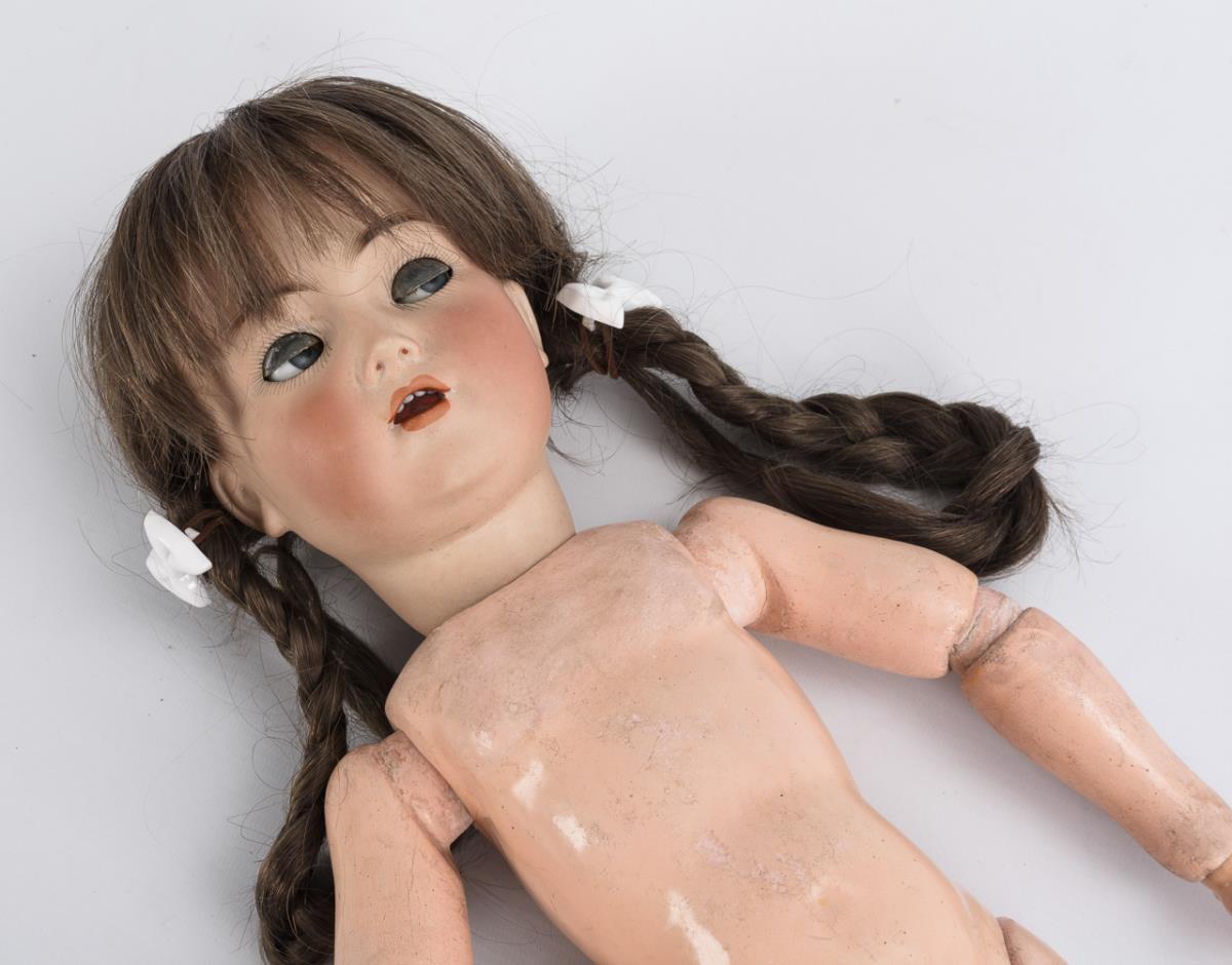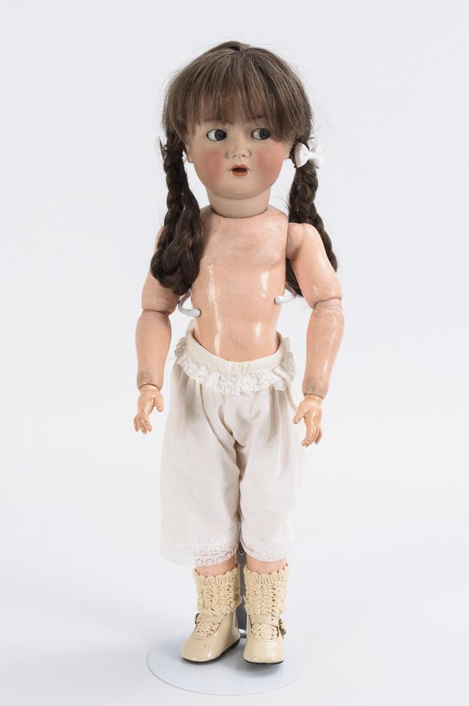 Kurbelkopf, blaue Schlaf-/Schelmenaugen, braune Echthaarperücke mit Zöpfen. 17-teiliger, schlanker Toddlerkörper mit langen Unterschenkeln. Mit weißer Unterhose bekleidet. Kopf durchleuchtet: ohne Defekte. Füße mit kleinen Farbdefekten.
