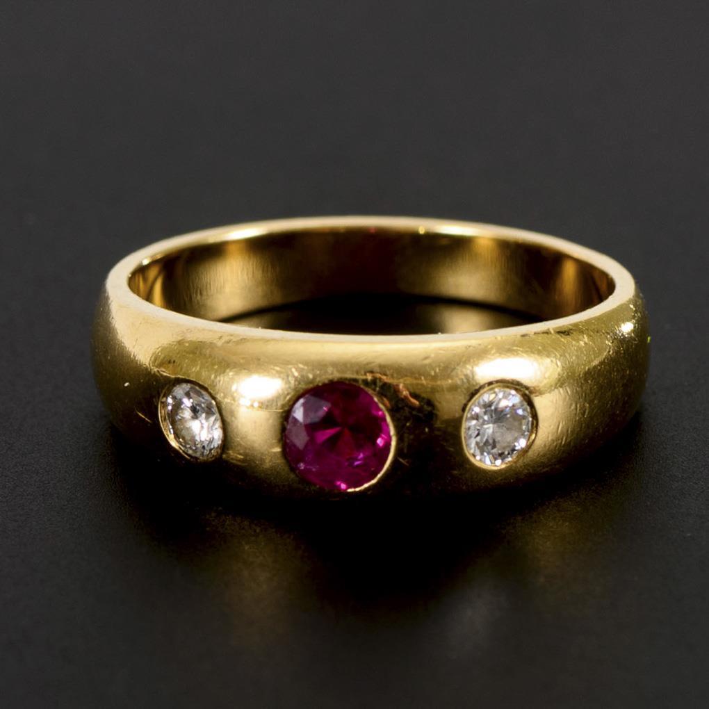Eingelassener Rubin und 2 Brillanten in mittlerer Schiene.