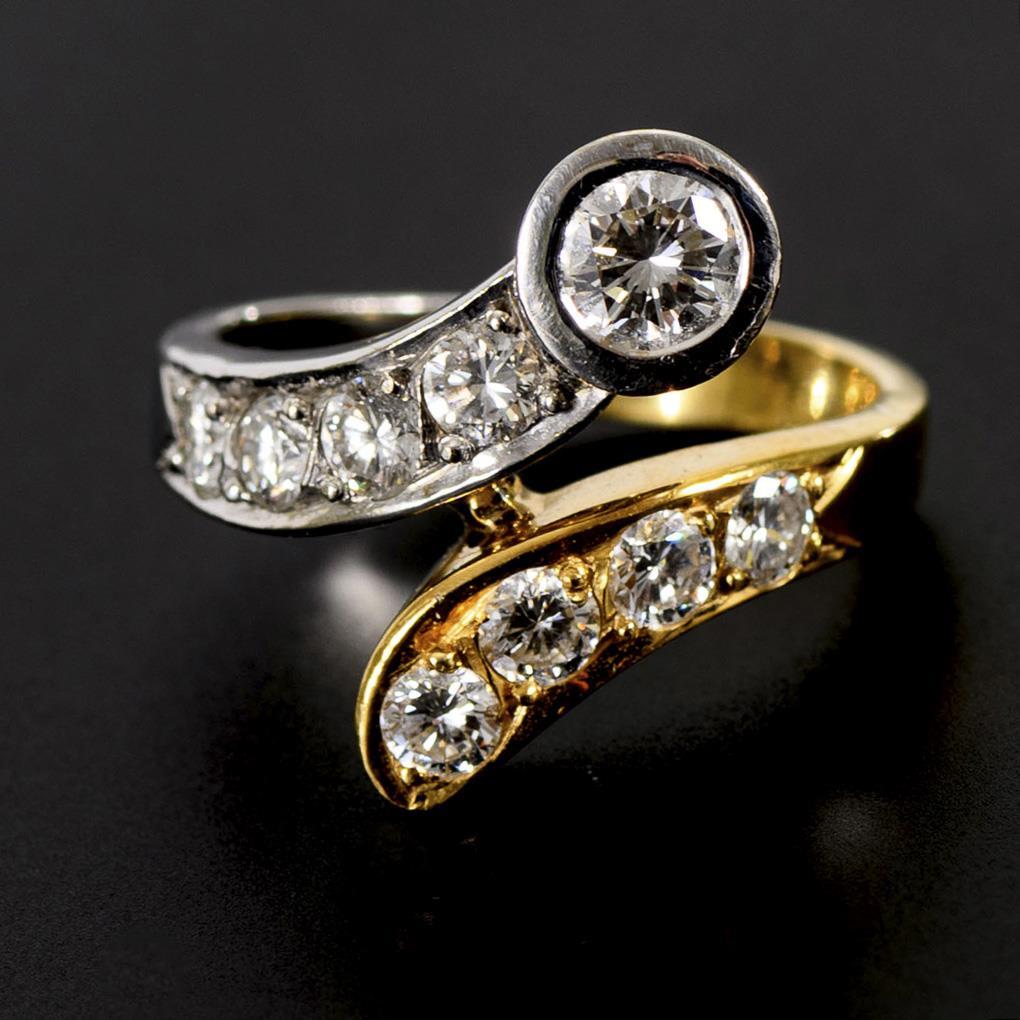 Gelbgold/Weißgold 750 gestempelt. Ringgröße 54. Brillant Ø ca. 4,5 mm/8 Brillanten Ø ca. 3 mm/W/vs. 9,2 g.