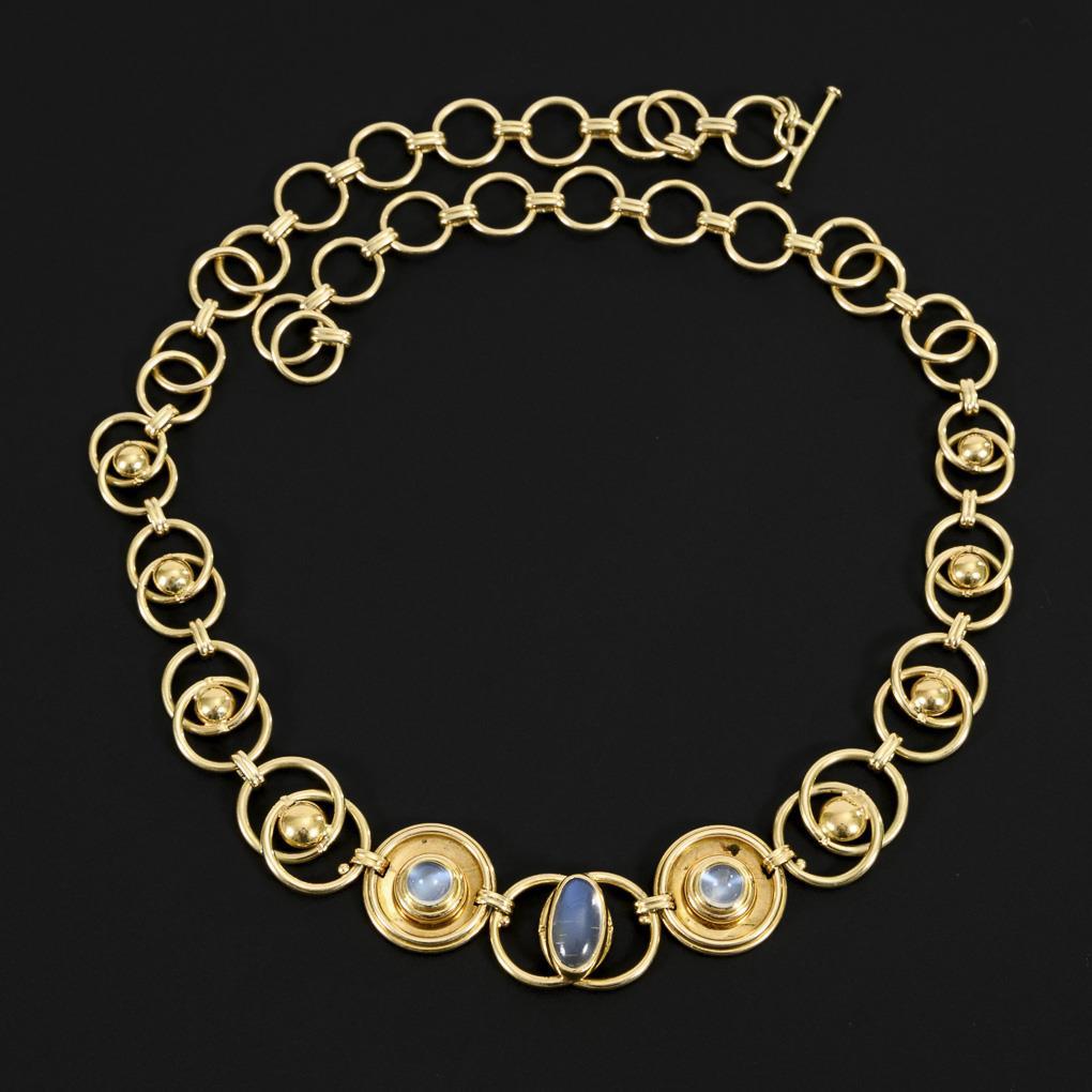 Ringgliederkette im Verlauf, mit 3 zargengefassten Mondsteincabochons. Knebelschließe.