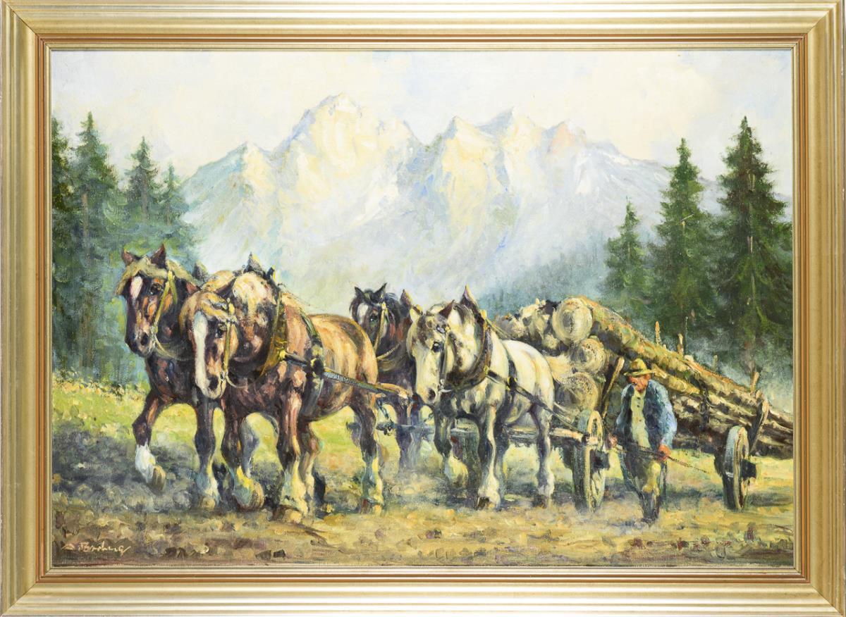 Undeutlich signiert: Bauer mit Pferden und Holzkarren